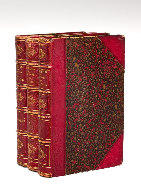 3 vol. in-8 reliure de l'époque demi-chagrin à coins rouge, dos à 4 nerfs dorés orné, Imprimerie et Lithographie Barbier Frères, Montbéliard, 1882, VI-361 pp. avec une grande carte déplainate en couleurs ; 451 ; 361 pp. et 6 planches hors texte Rare exemplaire de l'édition originale de cette monographie consacrée au village de Beaucourt, dans le Territoire de Belfort. Etat très satisfaisant (accroc en coiffes sup., rel. un peu frottée, accroc sans mq. avec traces d'anciennes restauration à l'adhésif à la carte dépliante, bon état par ailleurs).