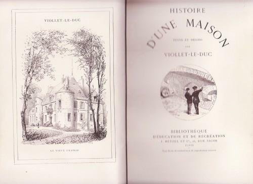 in 8°, pp. 4, 260; leg. coeva m/marocchino rosso, ds. a nervi con tit. e fregi in oro, stemma di Parigi in oro al piatto, tagli dorati, sguardie moiré; con 62 disegni dell'A. n.t. e f.t., di cui 4 cromolitografie, che ill. le varie fasi di costruzione della casa. Esemplare fresco. 564/37