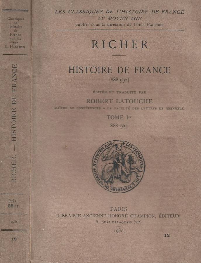 Opera incompleta, disponibile il tomo I: 888-954, edito e tradotto a cura di Robert Latouche, edizione francese, volume brossurato datato con copertina di carta originale segnata da leggera usura lungo i bordi, angoli lievemente compressi, escoriazioni alle cuffie. Vol. n. 12 della collana diretta da Louis Halphen, interno ben conservato, carte ancora intonse uniformemente ingiallite dal tempo, tagli irregolari. N. pag. 303.