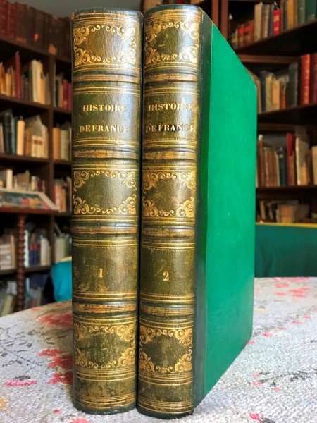 Due volumi in 8 grande, legatura coeva in mezza pelle, dorsi a quattro nervi, impressi e decorati in oro, titoli al dorso in oro, sguardie marezzate, bianche, occhielli, frontespizi, notizie biografiche su Anquetil, IV, 1302 pp., 1 carta di Avviso delleditore, bianca finale, 20 tavole f.t. da incisione su rame, protette da velina. Stampato in doppia colonna. Importante opera storiografica, di grande respiro, trattata ed esposta in modo peculiare e molto efficace da Anquetil su richiesta di Napoleone. Lopera completa in quattro volumi, i primi due qui presentati contengono la narrazione dAnquetil (come spiegato nellAvviso editoriale al termine del secondo volume), dal 600 a.C. circa (abbracciando lintera storia dei Galli), fino alla Seconda Assemblea dei Notabili 1788 d.C. Nel terzo volume la storia sar ripresa e continuata da Leonard Gallois. Meritano menzione le splendide tavole f.t., commissionate a giovani illustratori e del tutto inedite. Tranne che per una lieve gora alle prime tre carte, volumi in ottimo stato ed elegante veste editoriale.
