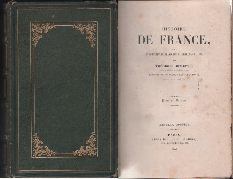 rilegato in pieno cuoio verde scuro con titoli in oro ai piatti e al dorso, quattro nervi al dorso, tagli dorati, 17,5x27 cm ca., 630 pp., con 500 incisioni di Jules David, nel testo e fuori testo, quelle ft su carta più pesante e protette da velina.