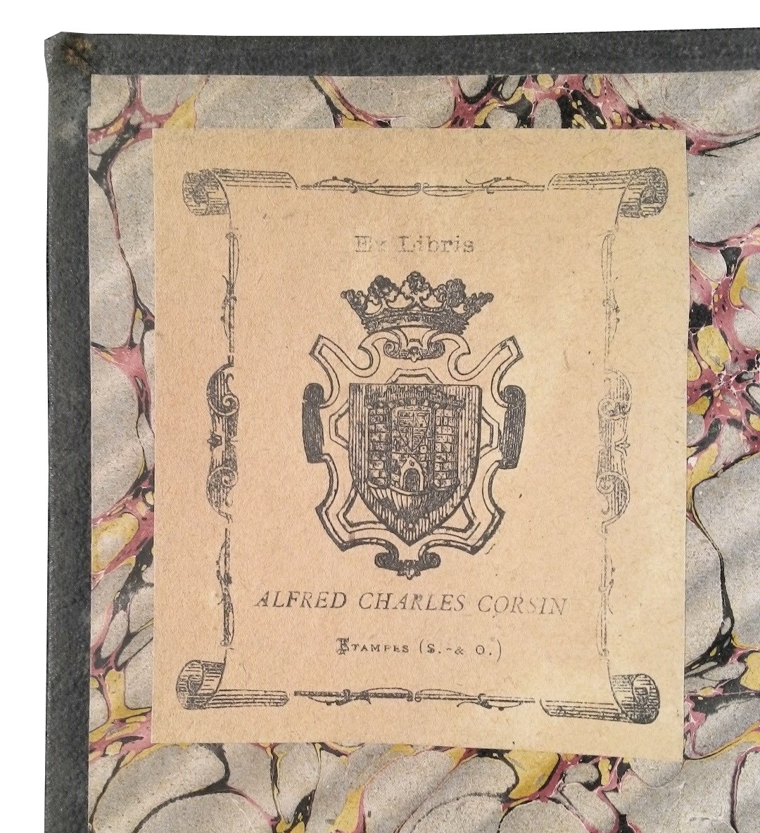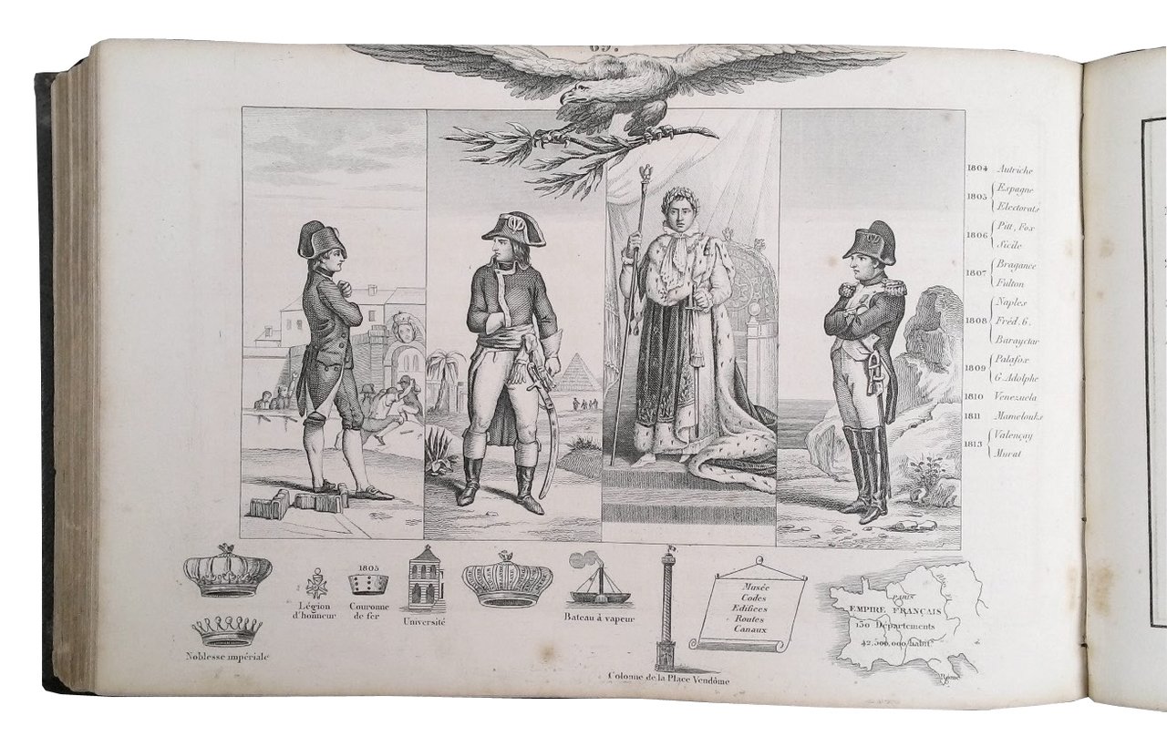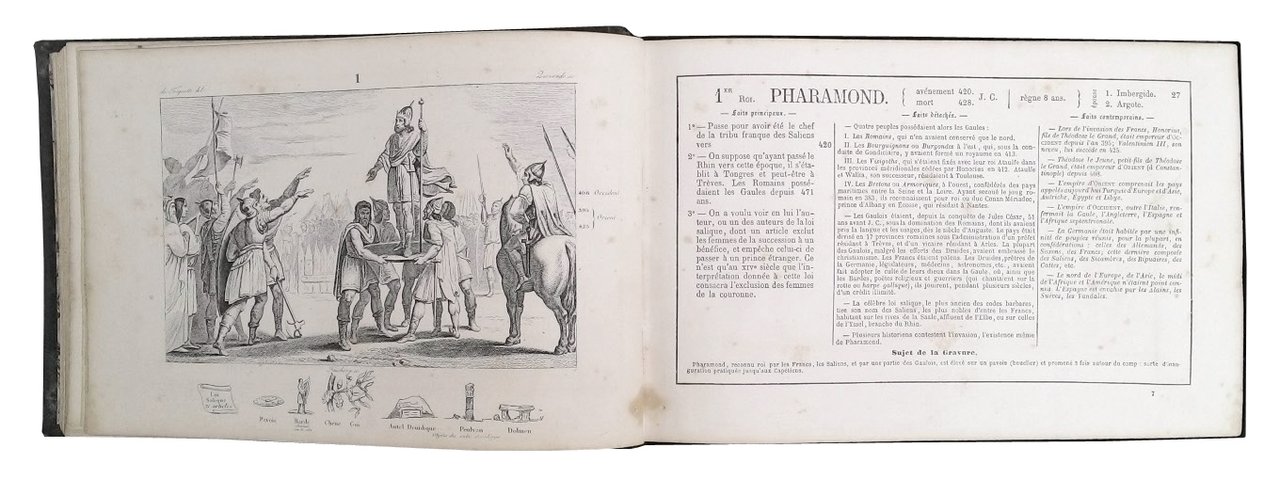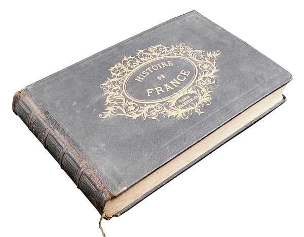 4to, oblungo (150x232 mm); leg. editoriale in tela percalina nera, con dorso a 4 nervi, titolo in oro al dorso e al piatto anteriore entro fregi in oro; pp. 256; bellissima incisione al frontespizio a cornice del titolo, 74 inc. in acciaio f.t. disegnate dallo scultore e disegnatore francese, Henry de Triquetti (1804-1874); 2 tav. più volte ripiegate ed una mappa storica della Francia, con a lato l'Italia e la Turchia, più volte ripiegata; manca la tav. 20, che però è sostituita dalla tav. 21, in doppione (trattasi di errore dell'editore). Rara prima ed unica edizione di questa storia illustrata di Francia su tavole sinottiche, a cura del Colart. L’anno di pubblicazione non è indicato, ma dovrebbe essere circa il 1880. Prov.: ex libris al contropiatto anteriore di Alfred Charles Corsin. -- in-4° oblong, 256 pp., 77 gravures dont une grande carte depliante; il manque la planche 20, remplacée par la planche 21, en double; reliure d'edition. -- Oblong quarto 6.25 x 9". Original boards, leather spine with gilt lettering. 256 pp, engraved title, 74 steel-engraved 'gravures', plus 2 folding historical maps and 1 folding table. -- Rif.: Opera non censita in ICCU. OCLC, 47255778 (1 copia in Japan e 2 in USA). Cond.: Leggere fioriture; macchie d'umido in basso a sin. alle prime 25 pp.; opera in buone condizioni generali.