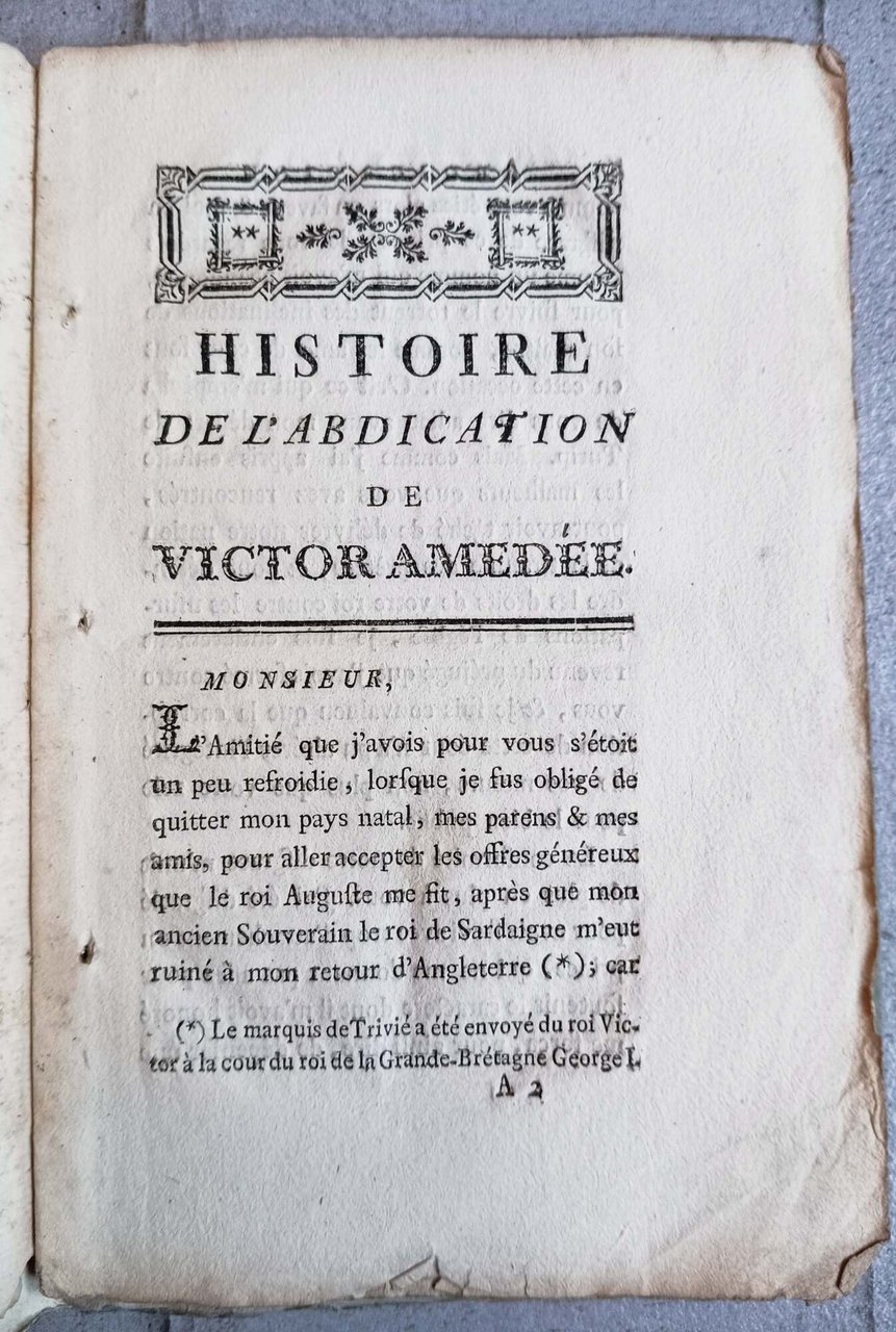 >in-8 (mm 183x120), pp. 51, brossura posteriore azzurra. Seconda edizione stampata a Londra (la prima uscì aTorino nel 1734). Il conte Radicati, durante il suo esilio a Londra, pubblica con un discreto successo questo libro che ricostruisce i retroscena dell'abdicazione di Vittorio Amedeo II. Esemplare fresco e marginoso.