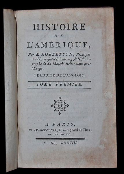 Histoire de lAmerique. Par M. Robertson, Principal de lUniversité dEdimbourg, et Historiographe de Sa Majesté Britannique pour lEcosse. Traduite de lAnglois. Tome Premier Second Troisieme. Completo.