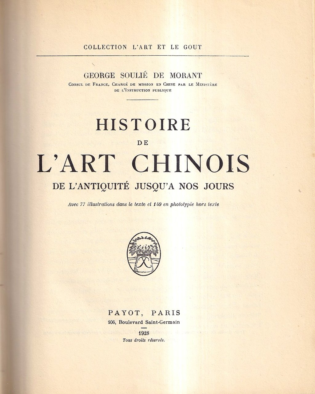 Edizione originale francese / Original French edition. Collection "L'art et le gout" - Volume in bella legatura artigianale in mezza pergamena con titolo manoscritto al dorso, taglio superiore dipinto in oro e nastrino segnapagine; copertine a stampa conservate all'interno; 300 pagine arricchite da 77 illustrazioni nel testo e 149 splendide illustrazioni fototipiche fuori testo. George Soulié de Morant, console di Francia, fu assegnato alla Cina dal Ministero della Pubblica Istruzione: diplomatico, romanziere, saggista, traduttore di letteratura cinese e storico dell'arte e della cultura cinese, è stato responsabile dell'introduzione e dello sviluppo dell'agopuntura in Francia attraverso i suoi lavori, studi e pubblicazioni. -- Esemplare in condizioni eccellenti, da collezione.