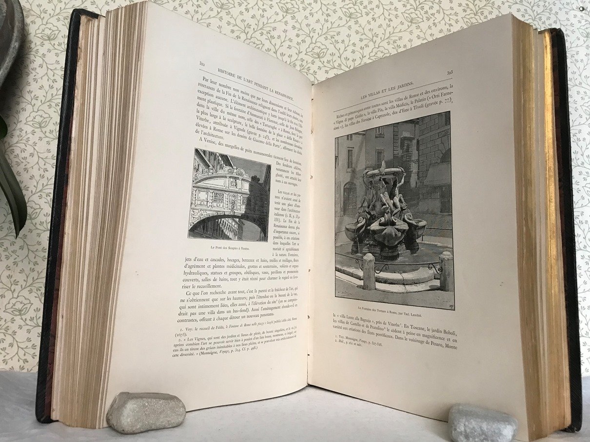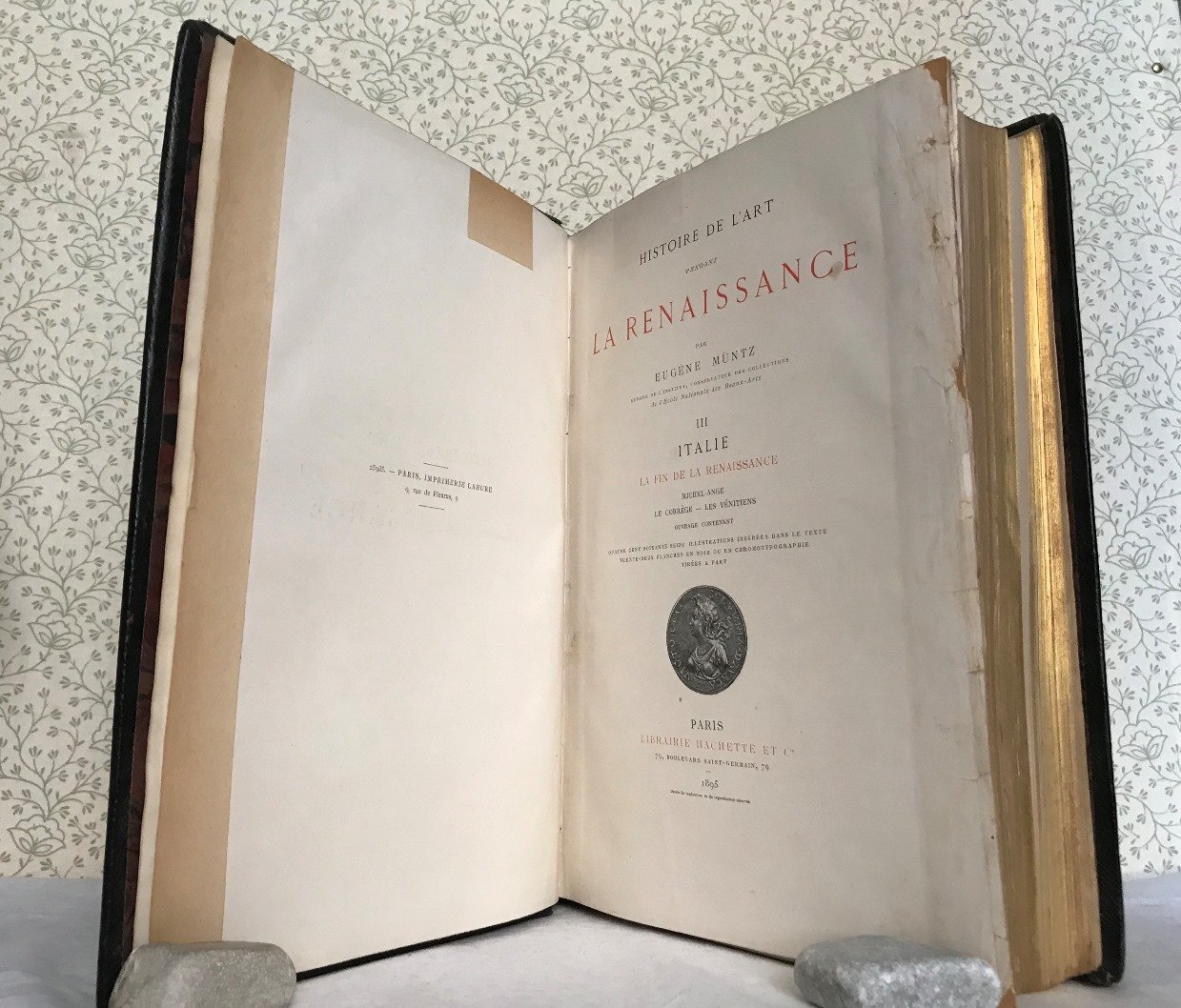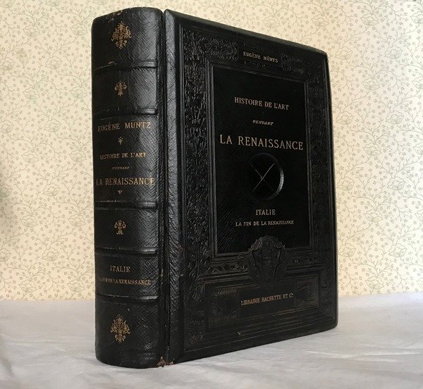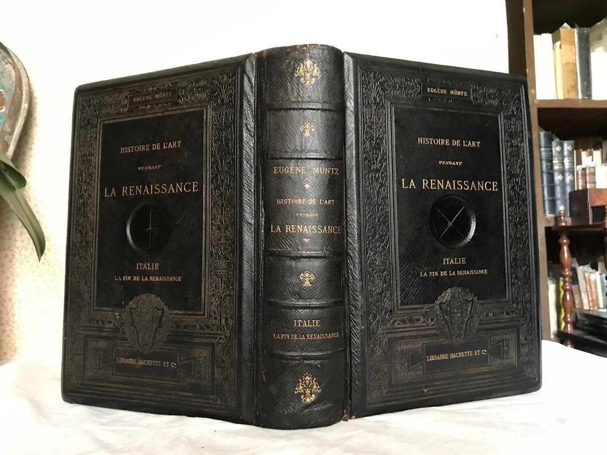 Volume in 4, legato in pelle, titolo al piatto ed al dorso impresso con fregi e dorature, nervi a vista, tagli dorati, sguardie marmorizzate, occhiello, frontespizio, indice, 757 pp. illustrato da numerose riproduzioni delle opere citate e da vignette, nt. e ft. Volume in perfette condizioni di conservazione, da segnalare la bella legatura unico rammarico la mancanza si presume di medaglioni applicati sui piatti. Davvero splendido il saggio di Muntz, ancora oggi oggetto di studio e sicuro cardine per la conoscenza del periodo artistico trattato. Iconograficamente ricchissimo, illustrazioni deccezionale fattura. Numerosissime le tavole ft. Assolutamente non comune in questedizione, splendido.