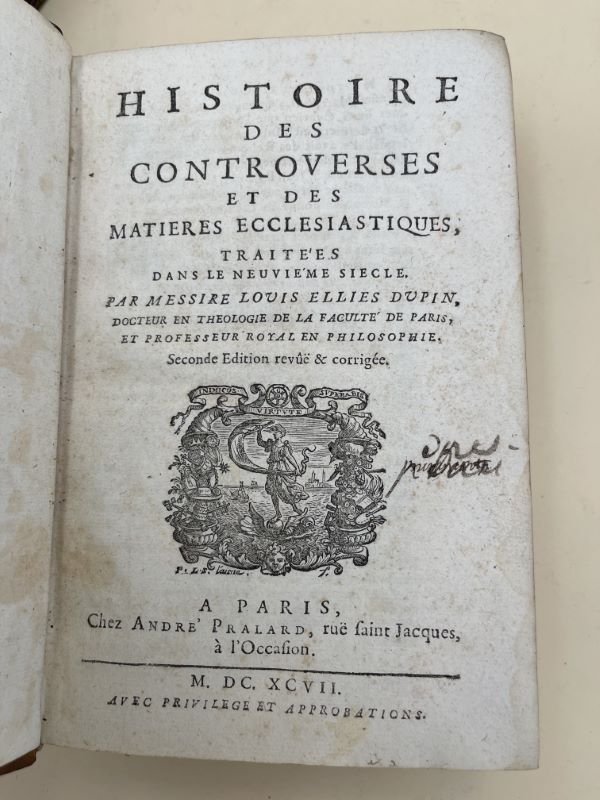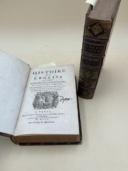 chez André Pralard 1701 Paris, chez André Pralard, 1701 - 1703. 2 volumes In-8 reliés plein veau de l'époque, dos à cinq nerfs très orné, pièce de titre rouge. 801 pages pour le 1er volume + 935 pour le second avec une pagination fantaisiste. Petit manque de cuir à la coiffe du 1er volume, également léger manque de cuir à la coiffe du second volume ainsi qu'en queue, coins légèrement émoussés. L'auteur, historien ecclésiastique, issu d'une famille noble de Normandie. Exemplaire bien conforme à la présentation qu'en fait son auteur quant aux divisions de l'ouvrage, savoir L'Histoire ecclésiastique du XVIe siècle se partage naturellement en 4 parties : La 1ere comprend ce qui s'est passé depuis le commencement du siècle jusqu'au schisme de Luther, qui s'est élevé en 1417. On y rapporte ce qui s'est fait en France et à Rome touchant la Pragmatique et le Concordat et l'histoire des Conciles de Pise et de Latran. La seconde partie contient l'histoire de la naissance et du progrès du Schisme de Luther et des sectes qu'il a produites, jusqu'à la convocation du Concile de Trente. On y représente les troubles excités en Allemagne au sujet de la religion, les assemblées, les conférences, les confessions de foi, les édits, les disputes et les écrits faits sur cette matière, tant par les Catholiques que par les Sectaires. L'origine de l'Hérésie des Sacramentaires et les contestations qu'ils eurent avec Luther et ses disciples. La toisième partie contient une ample Histoire du Concile de Trente et des choses qui se sont passées en Europe touchant la Religion depuis la convocation de ce Concile jusqu'à la fin, c'est à dire jusqu'en 1564. Il y aura un chapitre particulier destiné pour l'histoire de la Révolution d' Angleterre. La dernière partie contiendra la relation de ce qui s'est passé depuis la tenue du Concile de Trente jusqu'à la fin du siècle. Les troubles de la France et de la Hollande, auxquels la religion a servi de prétexte, en seront le principal sujet. Bel exemplaire malgré les défauts signalés, particulièrement intéressant pour toute l'histoire de la Réforme