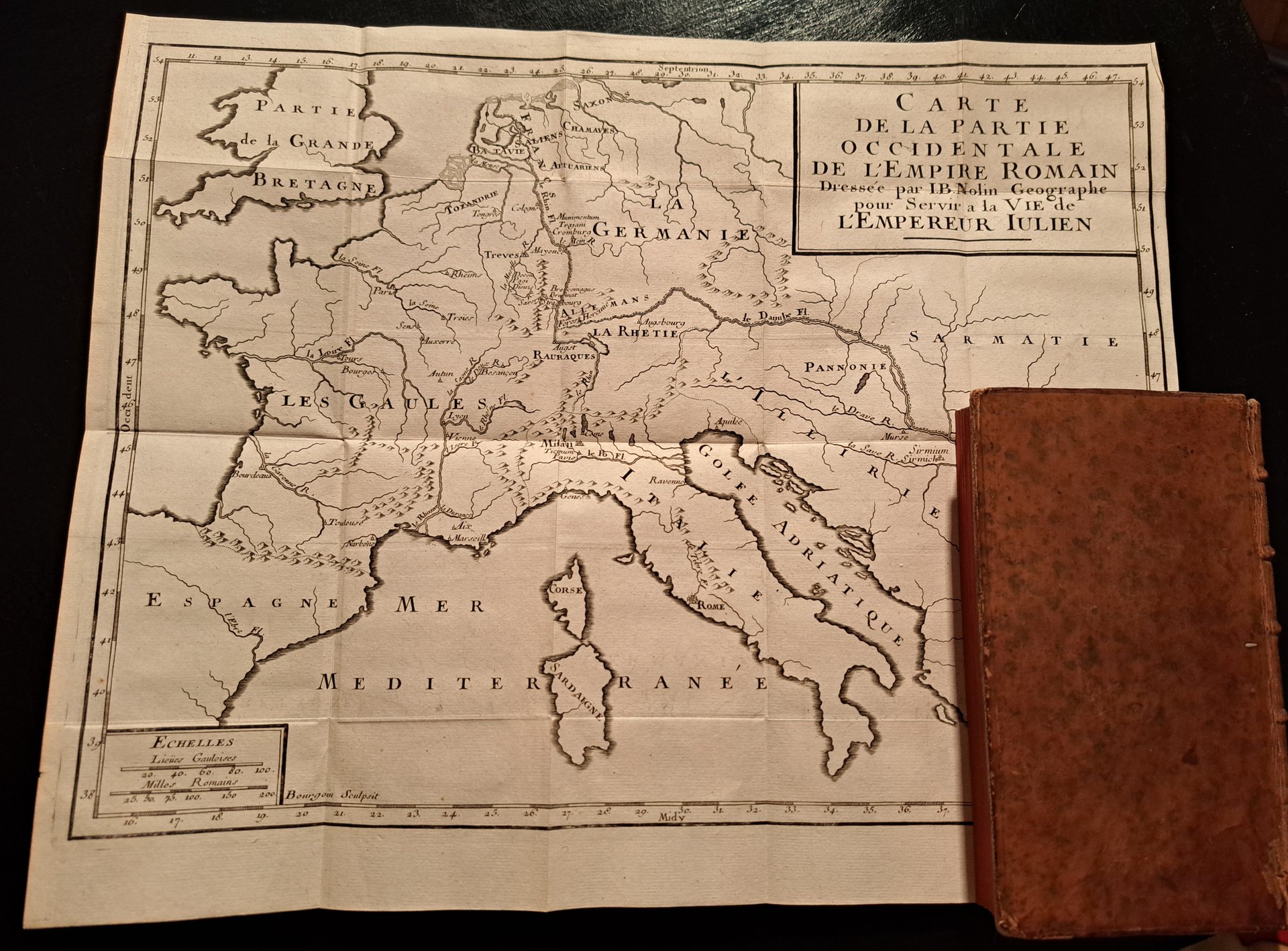 2 voll. in 12°, p. (4) LXIV,395 (3) (8); (4)408. La Table des Matières(p. 409 - 435) è legata in fondo al primo vol. anziché alla fine del secondo. 2 antiporte e una bella carta geografica ripiegata dell'Impero romano d'occidente, quasi sempre mancante. Esemplare eccellente. Legatura coeva in pelle con nervature, impressioni in oro e doppio tassello ai dorsi. Piccole mende alle cerniere e alle cuffie del primo vol. Tagli rossi. (Cioranescu, 35033).