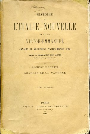 In-8°, pp. 343, brossura editoriale con dorso restaurato. 15 ritratti di personaggi del nostro Risorgimento disegnati e incisi su acciaio f.t. da Metzmacher, tra cui uno di Carlo Alberto all'antiporta. Dedica autografa di Charles de La Varenne 'a Monsieur le Marquise Monticelli, hommage d'affectueuse respect'. Una firma ottocentesca del dedicatario, il Marchese Pietro Monticelli. Fioriture. Discreto esemplare in barbe. Edizione originale dell'unico volume pubblicato (alla brossura di retro è scritto 'sous presse pour paraitre incessamment le deuxième volume', che, tuttavia, non vide mai la luce), notevolmente raro.