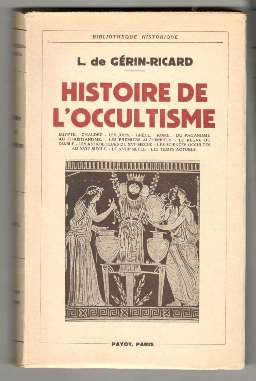 In 8°, pp. 319, (1). Brossura editoriale figurata. Copia in ottimo stato. Bibliothèque scientifique. Egypte - Chaldée - Les Juifs - Grèce - Rome - Du paganisme au christianisme - Les premiers alchimistes - Le règne du diable - Les astrologues du XVIème siècle - Les sciences occultes au XVIIème siècle - Le XVIIIème siècle - Les temps actuels.