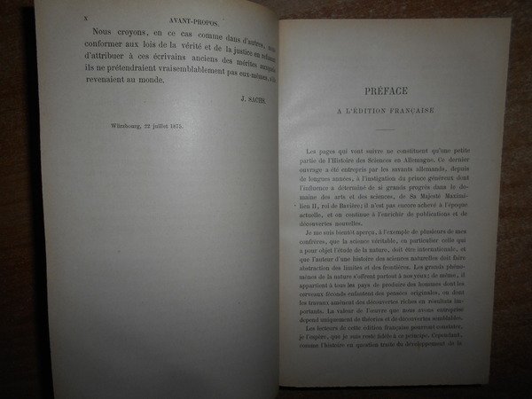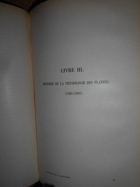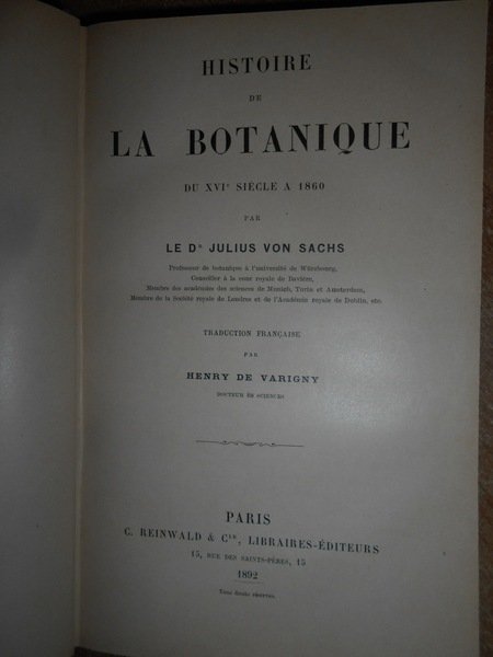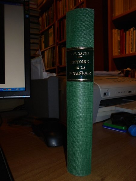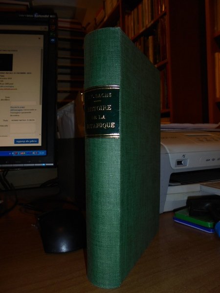 Julius Von Sachs. Paris, Reinwald, 1892. Histoire de la BOTANIQUE du XVI Siècle a 1860. In-8°, tela verde con titolo in oro entro tassello al dorso. XVI, 584 pp. Uno dei più importanti trattati di botanica del XIX secolo, apparso per la prima volta in tedesco nel 1875. L'opera è divisa in tre parti: Histoire de la Morphologie et de la Systématique 1530-1860; Histoire de l'anatomie végétale 1671-1860; Histoire de la physiologie végétale 1583-1860. Perfetto esemplare. Uff. C - IV - 7