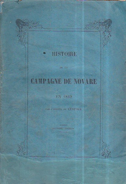 In-8°, pp. 173, brossura editoriale azzurra con titolo a stampa. Reintegrazioni alla brossura. Buon esemplare in barbe. Seconda ediizone, contemporanea alla prima, di quest'anonima opera di pubblicistica risorgimentale sulle guerre d'indipendenza del Piemonte del 1849, e sulla battaglia della 'fatal Novara' dello stesso anno in particolare. Autore del curioso libello fu Alexandre Le Masson; in esso si ritrovano accenni all'armistizio di Milano, alle rivoluzioni di Roma e della Toscana, del Piemonte, di Napoli e della Sicilia, del Regno Lombardo-Veneto, ai piani di battaglia di Radetzky, al combattimento di Novara, all'insurrezione di Brescia e a quella di Genova, alla restaurazione in Toscana, ai francesi a Roma, alla resa di Venezia, al trattato di pace di Milano. Bertarelli, 3726.