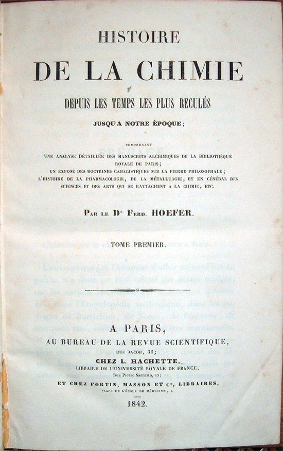 Due volumi in-8° (cm 21x13), pp. X, (2), 510; VIII, 518, legatura coeva in mezza pelle con titoli in oro al dorso. Normali segni d'uso ai piatti della legatura. Al Volume primo, a pagina 114, due lettere reintegrate a matita su piccolo restauro; firma d'appartenenza a pagina 510. Al Volume secondo, alone d'umido nel margine esterno delle pagine da 1 a 14; alla carta che ospita le pagine 279-280, nel margine esterno, strappo che interessa il testo, senza perdite, restaurato con carta giapponese. Firma d'appartenenza a pagina 518. Per il resto, ottimo esemplare. Rara edizione originale. Lo scritto, estremamente accurato e documentato, ricco di preziose e dettagliate informazioni frutto di minuziose ricerche, ricostruisce la storia dell'alchimia e della chimica dall'antichità ai primissimi anni del secolo XIX, prendendo in esame la teoria e l'opera di un gran numero di filosofi, alchimisti, cabalisti, studiosi, scienziati, ivi compresi gli antichi meno conosciuti e dediti a pratiche magico-iniziatiche, rivelando le loro idee, i loro procedimenti, i loro segreti, le loro scoperte. Per alcuni di questi personaggi l'autore riporta una bibliografia ragionata. Jean-Chrétien-Ferdinand Hoefer, chimico francese d'origine tedesca (Döschnitz, Schwarzburg, 1811 - Brunoy, Essonne, 1878) fu studioso di grande erudizione. Svolse gran parte della sua attività di storico, medico e pubblicista in Francia. Si occupò in particolare di storia della scienza. Table des matières. Tome premier. Préface. Un mot sur l'histoire de la science. Première époque. Depuis les premières temps historiques jusqu'au IX.e siècle de l'ere chrétienne. Section première. Depuis les premières temps historiques jusqu'à Thalès (620 ans avant J. C.). I. Chinois; II. Indiens (Hindoustanis); III. Égyptiens - Phéniciens - Hébreux. Deuxième section. De 640 avant J. C. au III.e siècle après J. C. (École d'Alexandrie). IV. Grecs - Romains. A. Partie théorique - Systèmes des philosophes de la Grèce. B. Partie pratique. Trisième section. Du III.e siècle au IX.e siècle après J. C. Art sacré; Documents relatifs à l'Art sacré. Deuxième époque. Depuis le IX.e siècle jusqu'au XVI.e siècle. Section première. Du IX.e au XIII.e siècle. Chimistes arabes; Grecs byzantins; Italiens, Français, Allemands. Deuxième section. Du XIII.e siècle jusqu'au commencement du XVI.e siècle. Appendice. Tome deuxième. Troisème époque. Depuis le XVI.e siècle jusqu'au XIX.e siècle. Section première. XVI.e siècle. I. Chémiatrie (chimie appliquée à la médecine); II. Chimie métallurgique; III. Chimie technique; IV. Alchimistes. Deuxième section. XVII.e siècle. Chimie pharmaceutique. Chimie des gaz. Fondations des sociétés savantes. Chimie technique. Chimie métallurgique. Alchimie. Troisième section. Coup d'oeil général. Il titolo completo dell'opera recita Histoire de la chimie depuis les temps les plus reculés jusqu'a notre époque; comprenant une analyse détaillée des manuscrits alchimiques de la Bibliothèque Royale de Paris; une exposé des doctrines cabalistiques sur la pierre philosophale; l'histoire de la pharmacologie, de la métallurgie, et en général des sciences et des arts qui se rattachent à la chimie, etc. par le D.r Ferd. Hoefer.