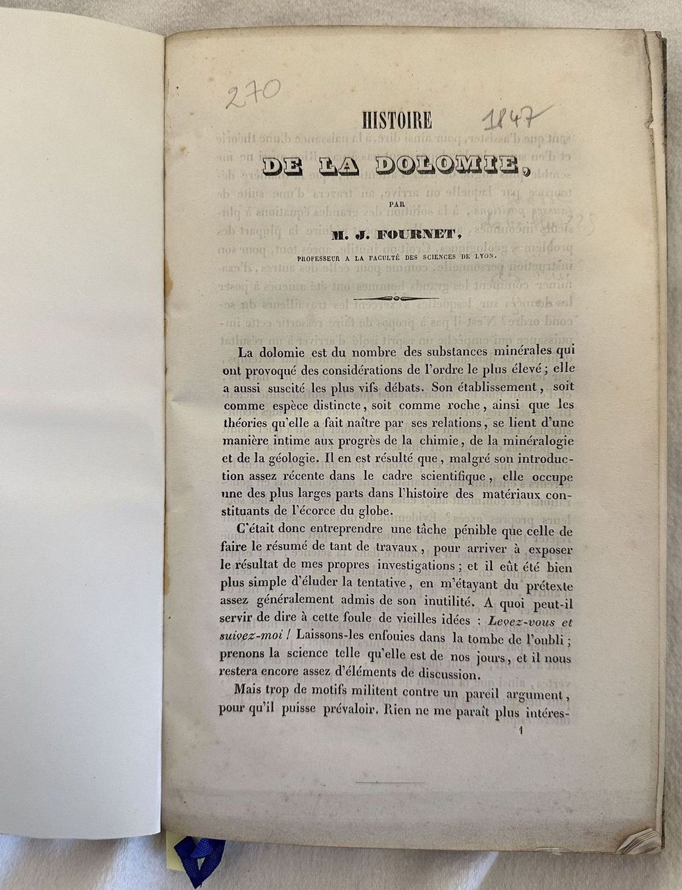 Rarissima pubblicazione senza data ma del 1847 sulla storia della dolomia scritta dal geologo e metallurgico francese Joseph Jean Baptiste Xavier Fournet (1801-1869). Professore all'Università di geologia di Lione, pubblicò numerose memorie e pubblicazioni di chimica e mineralogia. Alcune illustrazioni nel testo e alla fine due tavole fuori testo. Ex libris al contropiatto anteriore. In ottime condizioni. Copertina in mezza pelle con titolo e decorazioni in oro al dorso in ottime condizioni generali con lievi usure ai margini e dorso. Legatura in buone condizioni. Pagine in ottime condizioni con rare fioriture. In 4. cm 27x19,5. Pp. (1)+136+2 tav. Peso Kg. 0,350. Very scarce pamphlet not dated but of 1847 circa about the history of dolomia written by the french geologist and metallurgist Joseph Jean Baptiste Xavier Fournet (1801-1869). He was teacher in the University of Lione and published different memories and pamphlets of geology and mineralogy. Some illustrations in the text and two out of text plates in the end of the volume. Ex libris in the front counterplate. In very good conditions. Half leather coeval cover with gilted title and decorations in the spine in very good general conditions lightly worn in the extremities. Binding in good conditions. Pages in very good conditions with occasional foxing. In 4. cm 27x19,5. Pp. (1)+136+2 tav. Peso Kg. 0,350. <BR><BR>