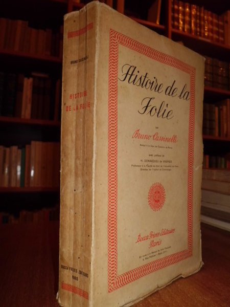 Bruno, Cassinelli. Paris, Bocca Frères Editeurs, 1939. Histoire de la folie. In - 8°, br. tavola a colori in antiporta, molte tavole in nero f.t. L' opera contiene anche la storia della psichiatria. xvii, 481 pp. e una c. n.n. Ben conservato. Uff. Mob 1.