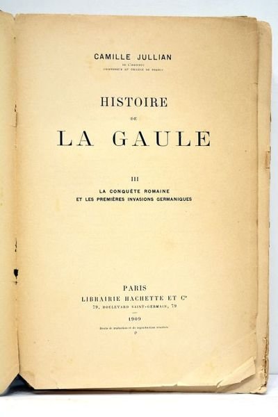 2 volumes. Tomes 1 et 3 seuls. 528 pages. + 607 pages. (26,5x17,5cm). Broché. Non rogné. Jaquette muette. Couverture manquante. Traces de papier sur le dos. Dos cassé et fendillé. Intérieur bruni. Infimes rousseurs. Quelques feuillets détachés. Marges un peu déchirées. Intérieur agréable. Ensemble de deux exemplaires brochés dépourvus de sa couverture mais dans un état agréable. Tome 1: Les invasions gauloises et la colonistation grecque. Tome 3: La conquête romaine et les premières invasions germaniques.