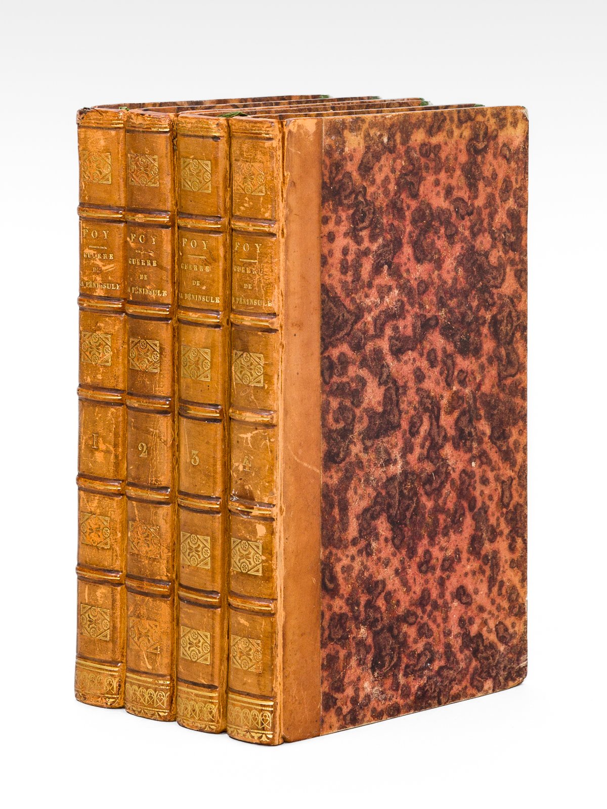 Publiés par Mme la Comtesse Foy, 4 vol. in-8 reliure de l'époque demi-veau blond, dos à 5 nerfs orné, Baudouin Frères, Paris, 1827, 4 ff., XV-403 pp. ; 421 pp. ; 2 ff., 406 pp. ; 2 ff., 373 pp. avec 8 fac-similés et un grand tableau dépliant Ouvrage important pour la compréhension de la Guerre d'Espagne. Etat très satisfaisant (sans l'atlas, dos un peu frottés avec petit accroc à une coiffe, mouill. marginale sur un tome, qq. rouss., bon état par ailleurs).
