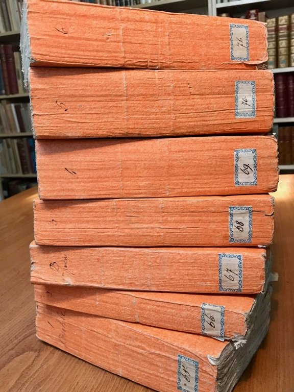6 tomi in 7 volumi in-8° (cm. 21,7), brossure arancioni coeve mute, carte in barbe e in ottimo stato; alcune fioriture e minimi segni d'uso. Traduzione francese della storia della filosofia moderna del Buhle, tra l'altro all'Indice. Buon esemplare genuino.