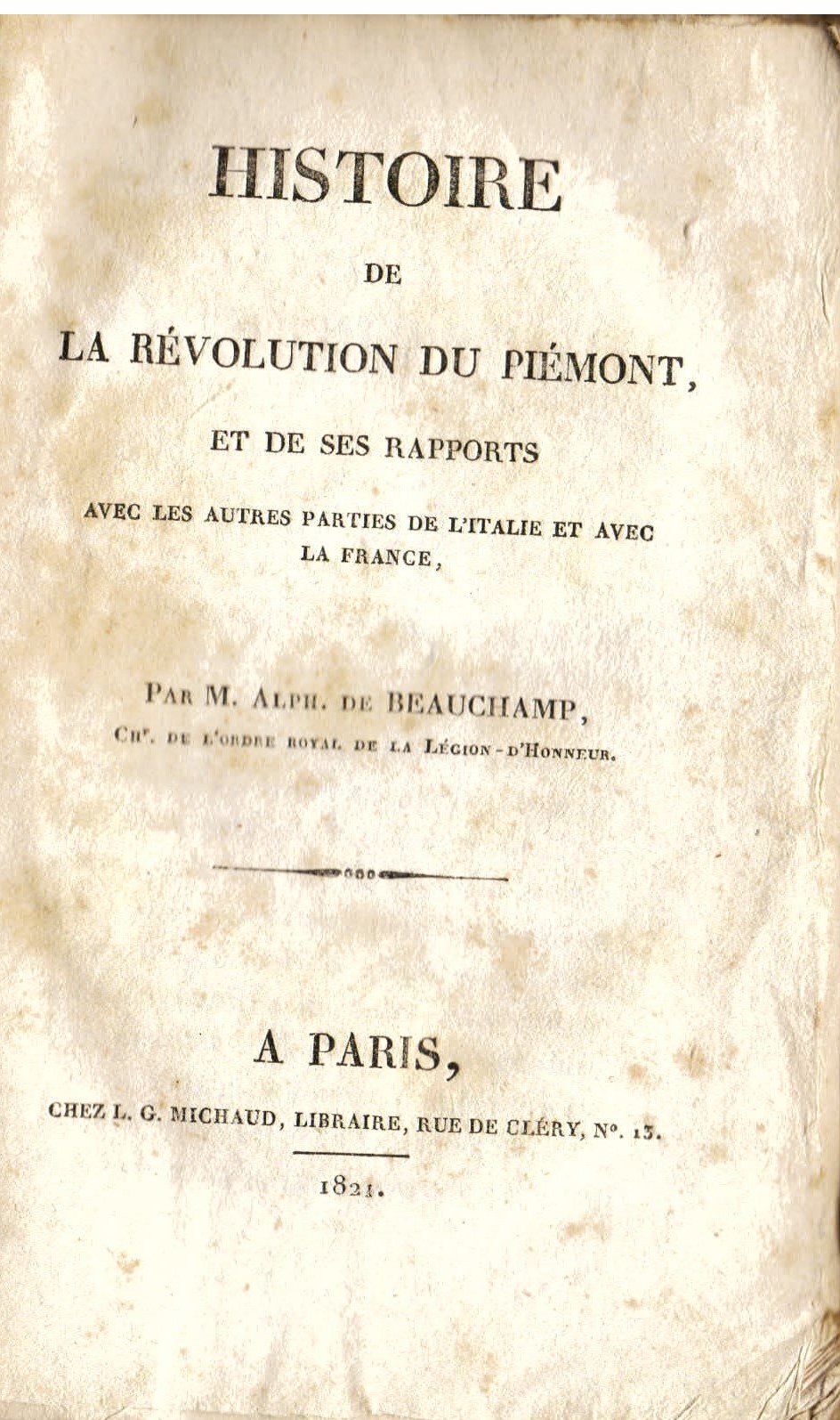 In-8° (205x105mm), pp. XVI, 212, (2), brossura originale azzurra. Piccoli restauri al dorso. Bell'esemplare in barbe. Edizione originale, non comune, di questo resoconto dei moti insurrezionali del 1821 in Piemonte visti dall'occhio severamente critico di un tipico storico francese filoborbonico e simpatizzante per la Restaurazione. 'Pièces justificatives' alle pp. 147 e sgg. Il libro, per la feroce posizione che vi era contenuta contro i patrioti italiani, suscitò lo sdegno di periodici liberali come 'Le Nain Jaune' e di Santorre di Santarosa, che ad esso replicò con 'De la Révolution piémontaise'. Due anni dopo il Beauchamp fece uscire una seconda parte dell'opera; 'l'uno e l'altro opuscolo sono uno sfruttamento a scopo retrivo dell'infelice tentativo piemontese e dànno l'impressione di essere stati scritti per far sentire l'opportunità di un controllo estero di qua delle Alpi' (Luigi Foscolo Benedetto). Il De Beauchamp (Monaco, 1767-Parigi, 1832) fu, sotto la Convenzione, agente del Comitato di Sicurezza Generale e, nel periodo del Direttorio, addetto alla sorveglianza della stampa. In seguito, in età napoleonica, assurse alla carica di alto e potente funzionario del Ministero della Polizia, carica da cui fu poi destituito da Fouché in quanto accusato di essersi servito indebitamente di documenti segreti nel compilare la sua 'Histoire de la Guerre de la Vandée et des Chouans depuis son origine jusq'à la pacification de 1801', che fu poi sequestrata. Esiliato a Reims, tornò nella capitale solo nel 1811 e, alla Restaurazione, ottenne una pensione dai Borboni, ricominciando la propria attività di storiografo - di livello oltremodo modesto - e di pubblicista filomonarchico abilmente opportunista. Lozzi, II, 3600. Manno, Informazioni sul Ventuno in Piemonte, p. 139. Torta, p. 290. Raccolta Bertarelli, n. 2133. Manca al Rosi.
