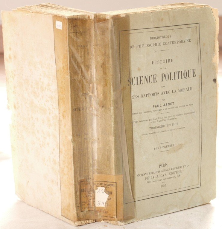 In 8. Dim. 23x14,5 cm. Pp. CI+608. Edizione del 1887 di questo importante testo sulla storia della scienza politica nei suoi rapporti con la morale del filosofo Paul Janet (1823-1899). Janet in questa monumentale opera analizza la storia della scienza politica dalle antiche civiltà orientali.<BR>L'opera era composta da due volumi, siamo purtroppo in possesso del primo tomo. Tra gli argomenti trattati: morale e politica dell'India, della Grecia; Aristotele, Platone, Cicerone; il cristianesimo ed il medioevo (San Tommaso d'Acquino; Dante); rinascimento (Machiavelli). Brossura editoriale in cattive condizioni generali con usure ai margini; dorso con nastro adesivo e piatto posteriore mancante. Legatura in cattive condizioni con rotture. All'interno le pagine si presentano in buone condizioni con fioriture. Edition of 1887 of this important text about the history of political sciences in its relationship with moral by the phylosopher Paul Janet (1823-1899). Janet in this monumental work analyzes the history of political science from ancient oriental civilizations.<BR>The work was made up of two volumes, unfortunately we have only the first volume. Among the issues treated: moral and politic of India, of Greece; Aristotle, Plato, Cicero; the christianism and Middle Age (Saint Tommaso d'Acquino; Dante); renaissance (Machiavelli). Editorial cover in bad general conditions with wearings in the edges; spine with adhesive tape and back plate missing. Binding in bad conditions with cracks. Inside pages are in good conditions with foxings.