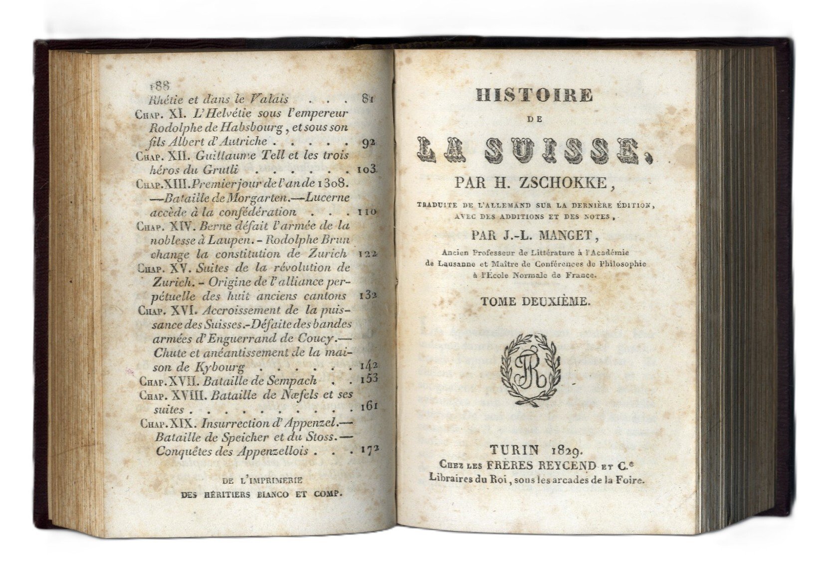 >4 tomi in un vol. in-16, pp.188, 175, 192, 184, leg. m.pelle, titolo oro su tassello al dorso. Dettagliata storia della Svizzera dalle origini all'inizio del sec. XIX, di cui narra ogni particolare geografico, politico, sociale, etc. Non comune. Fioriture sparse. Manca alle bibliogfrafie sulla Svizzera.