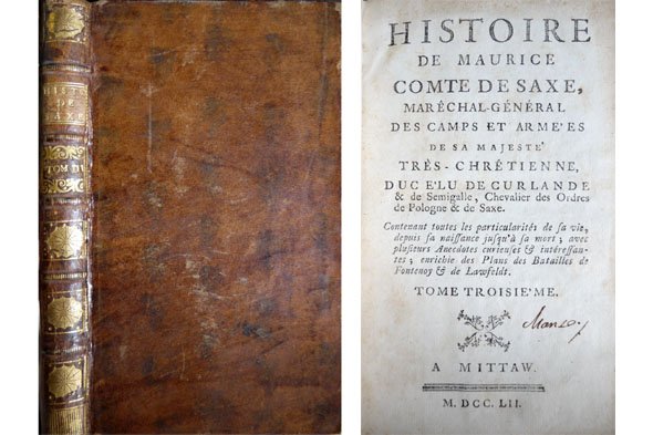 Mittaw, Mittau, 1752. 8vo.; 223 pp. y una lámina plegada con el "Plan de la Bataille de Lawfeldt" de 1748. Encuadernación de la época en piel con lomera ornada. Mauricio de Sajonia, Mariscal del Ejército Francés, era el primogénito de los aproximadamente 350 hijos ilegítimos del poderoso Federico Augusto, Rey de Polonia, habiendo iniciado su carrera militar a los 12 años, lo que le llevaría a ser una de las mejores cabezas militares de la historia.