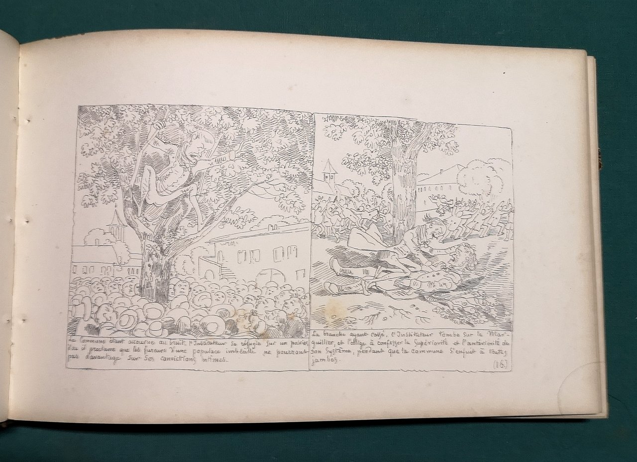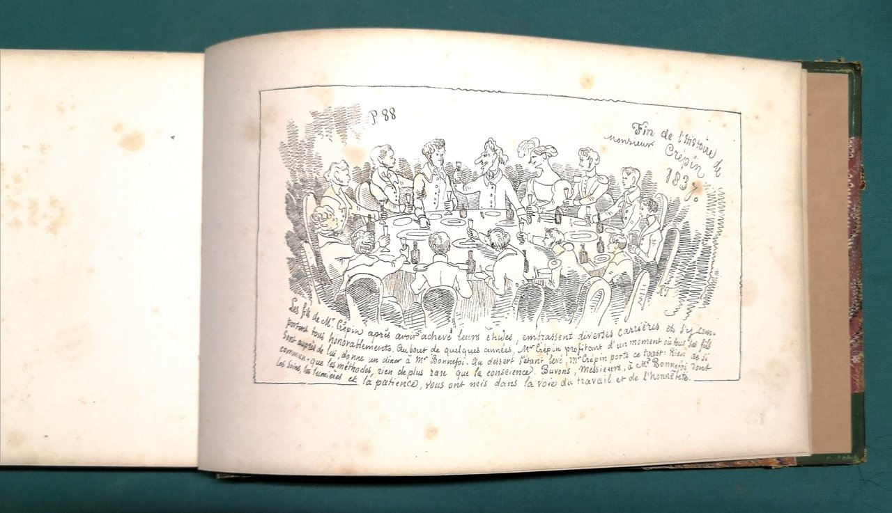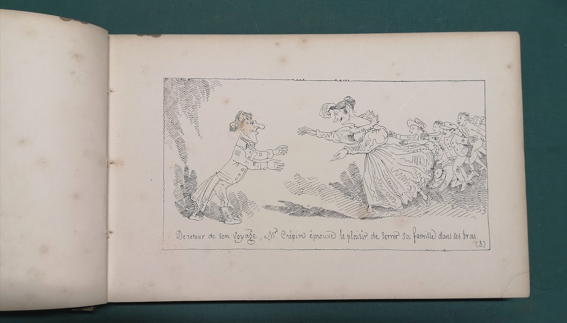 >album in-8 oblungo, ff. 88 tutti figurati al solo recto, inclusi il titolo e la prefazione. Legatura coeva in m. pelle verde e angoli, titolo in oro su tassello, filetti in oro su dorso a nervi. Prima edizione parigina uguale alla prima edizione ginevrina pubblicata nel 1837. Terza opera in “bande dessinée”, ovvero il prodromo dell'odierno fumetto, di cui Topffer viene considerato l'indiscusso creatore. Rara. Ottimo esemplare, lievissime e sporadiche bruniture. Carteret 592.