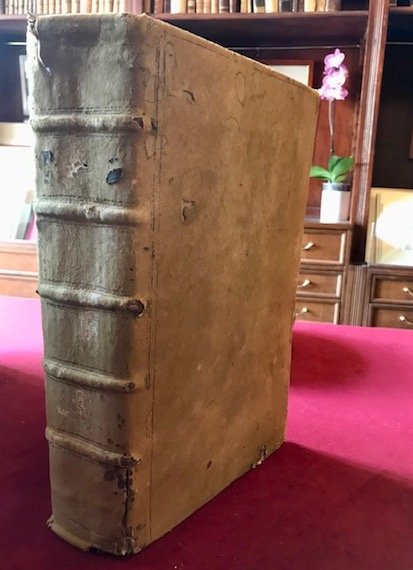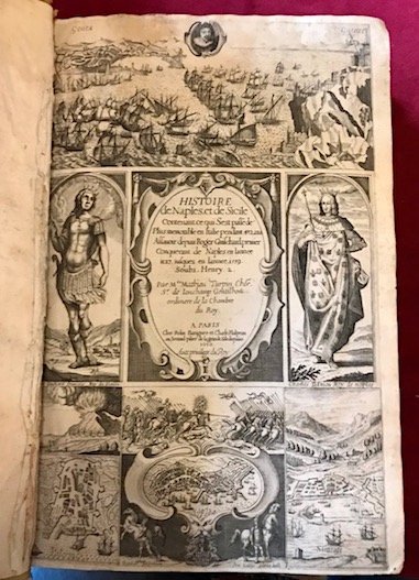 Folio (cm. 34,5), 5 cc.nn. (compreso primo frontespizio interamente inciso su rame con piccole vedute di Genova, Gaeta, Palermo, Napoli, Siracusa e del Vesuvio, oltre ai ritratti di Roberto il Guiscardo e Carlo d’Angiò e secondo a stampa con manrca tipografica), 1066 pp., 6 cc.nn. Con 12 ritratti n.t. raffiguranti i re di Napoli e di Sicilia. Testo riquadrato. Iniziali e fregi xilografici. Legatura coeva in pelle spugnata con nervi al ds. (abrasioni, piccole mancanze e tracce d’usura). Assente la carta di guardia libera anteriore. Lievi arrossature ed alcune macchioline ma, nel complesso, esemplare in più che buono stato di conservazione. Rara edizione originale. Brunet (Supplement), 814.