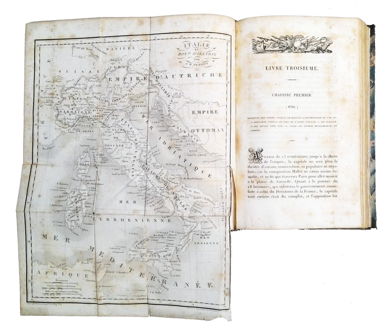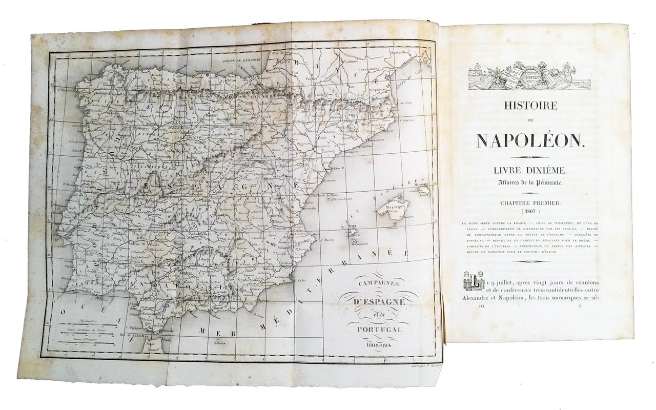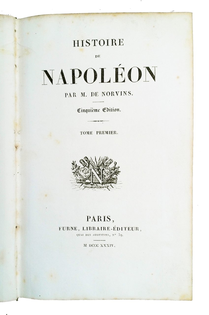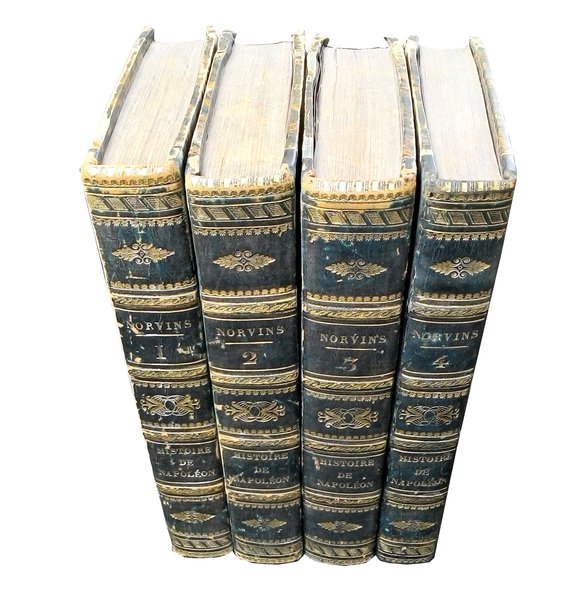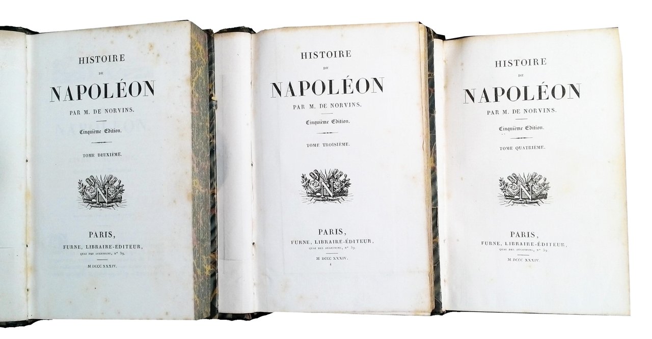 8vo (205x130 mm); leg. in mezza pelle blu con piatti in carta marmorizzata, dorso a quattro nervi finemente decorato a filetti e disegni floreali dorati e con titolo a caratteri dorati, guardie in carta marmorizzata, tagli marmorizzati; 4 vol.; pp. XVI, 384; 416; 430; 379; numerose incisioni in b/n alle antiporta e f.t. (la maggior parte su acciaio) protette da veline; vignette ai frontespizi (con il monogramma N di Napoleone e armi sullo sfondo); testate, capilettera e finali incisi; tavole delle battaglie in bicromia (nero e rosso); carte più volte ripiegate. Quinta ed. di questa prestigiosa opera storica su Napoleone, così composta: Tomo I (1769-1799): ritratto di Napoleone all'antiporta, prefazione dell'autore, 4 ritratti (Masséna, Kléber, Larrey e Bessheres), 3 scene di battaglia, 6 carte (Siège de Toulon, Bataille de Castiglione, Bataille d'Arcole, Bataille de Rivoli, Bataille des Pyramides, Bataille d'Aboukir); 2 grandi carte ripiegate (de l'Italie et Royaume d'Illyrie e de la Campagne d'Egypte et de Syrie)- Tomo II (1799-1807): ritratto di Napoleone all'antiporta, vista del Château de Malmaison, 3 ritratti (Ney, Talleyrand e Davoust), 2 scene di battaglia, 5 carte (Bataille de Marengo, Bataille de Toulouse, Bataille d'Austerlitz, Bataille d'Iena, Bataille d'Eylau), 1 carta ripiegata (de l'Allemagne servant à l'histoire des Campagnes Napoléoniennes) - Tomo III (1807-1913): ritratto di Josephine all'antiporta, 4 ritratti (Suchet, Lannes, Desaix e Macdonald), 4 scene di battaglia , 4 carte (Bataille de Wagram, Bataille de Smolensk et Valutina Gora, Bataille de la Moskwa, Bataille de Bautzen), 2 carte ripiegate (de l'Espagne et du Portugal et de la Campagne de Russie en 1812)- Tomo IV (dalla seconda campagna di Saxe al 1821): ritratto di Lasalle all'antiporta, 1 ritratto di Soult, 3 scene di Battaglia e una vista di Sant'Elena, una carta de la Bataille de Waterloo, una carta ripiegata de la campagne de 1814; testamento di Napoleone. Alla fine di ciascun tomo, una tavola-indice delle materie del volume. Jacques Marquet Montbreton, barone di Norvins (1769-1854) è stato un politico e scrittore francese. Rif.: IT\ICCU\BASE\001947 (altra ed). OCLC, 831891610 (T. 1), 719070725 (T. 2), 749825645 (T. 3) e 749939929 (T. 4). Cond.: Presenza di bruniture e macchie alle carte ed alle tavole, tracce d'uso alla legatura; fatti salvi i piccoli difetti indicati, trattasi di opera in condizioni generali molto buone.