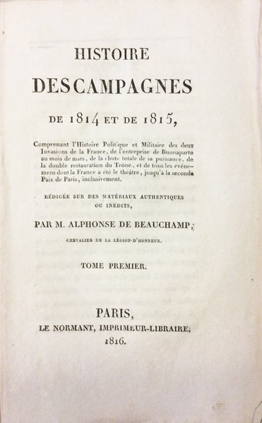 In-8 p. (mm. 215x132), 2 volumi in 4 tomi, brossura muta edit. blu (con mancanze e abras.), titolo stampato su tassello al dorso. Vol. 1°: pp. LVI,471; (seconda parte) (4),XXIV,521,(3) - Vol. 2°: pp. (4),554; (seconda parte) (4),607. Le seconde parti comprendono le récit de tous les événemens survenus en France en 1815. Nell'opera: l'histoire politique et militaire des deux invasions de la France, de l'entreprise de Buonaparte au mois de mars, de la chute totale de sa puissance, de la double restauration du Trone, et de tous les événemens dont la France a été le théatre, jusqu'à la seconde Paix de Paris, inclusivement. Importante ed esaustivo resoconto contemporaneo sui gloriosi 100 giorni. L'autore, Alphonse de Beauchamp, storico e pubblicista francese (Monaco 1767 - Parigi 1832), fu autore di numerosissime pubblicazioni. Con qualche lieve uniforme ingiallitura e fiorit. ma complessivam. esemplare con barbe be conservato.