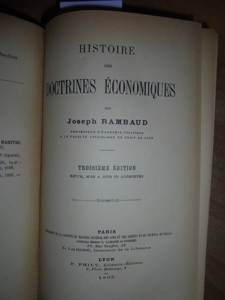 Joseph, Rambaud. Paris-Lyon, L. Larose-P. Phily, 1909. Histoire des Doctrines économiques. Trosième édition revue, mise a jour et augmentée. In-8° piccolo, tela con titolo in oro entro tassello al dorso, copertine originali conservate. 816 pp. Ottimo esemplare con lievi sottolineature e note in poche pagine in legatura recente con le copertine originali conservate. Uff. B - III - 2