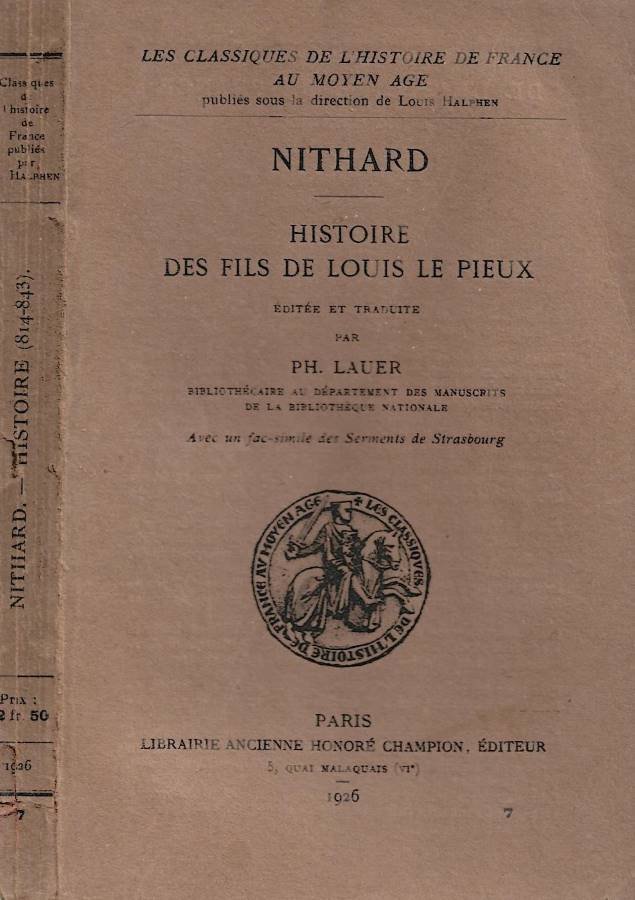 Racconto storico edito e tradotto a cura di Ph. Laurer, vol. n. 7 della collana, con un fac-simile dei 'Serments de Strasbourg' su carta patinata. Edizione francese, brossura filo refe con copertina coeva, pieghe da lettura al dorso, cuffia inferiore lacerata, minimo il distacco del piatto posteriore su cui ci sono piccole macchiette scure. Pagine ben preservate, tonalità maggiormente ingiallite in cornice, legatura ferma, tagli rifilati a mano e velati da polvere. N. pag. 167.