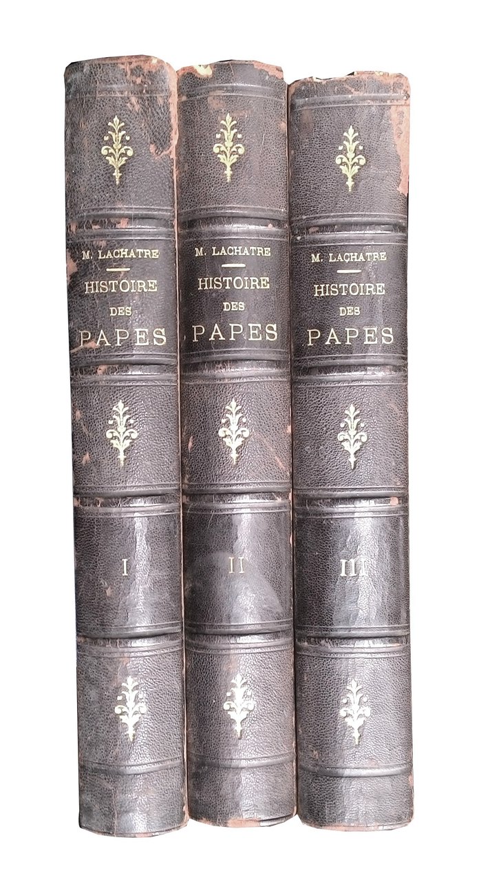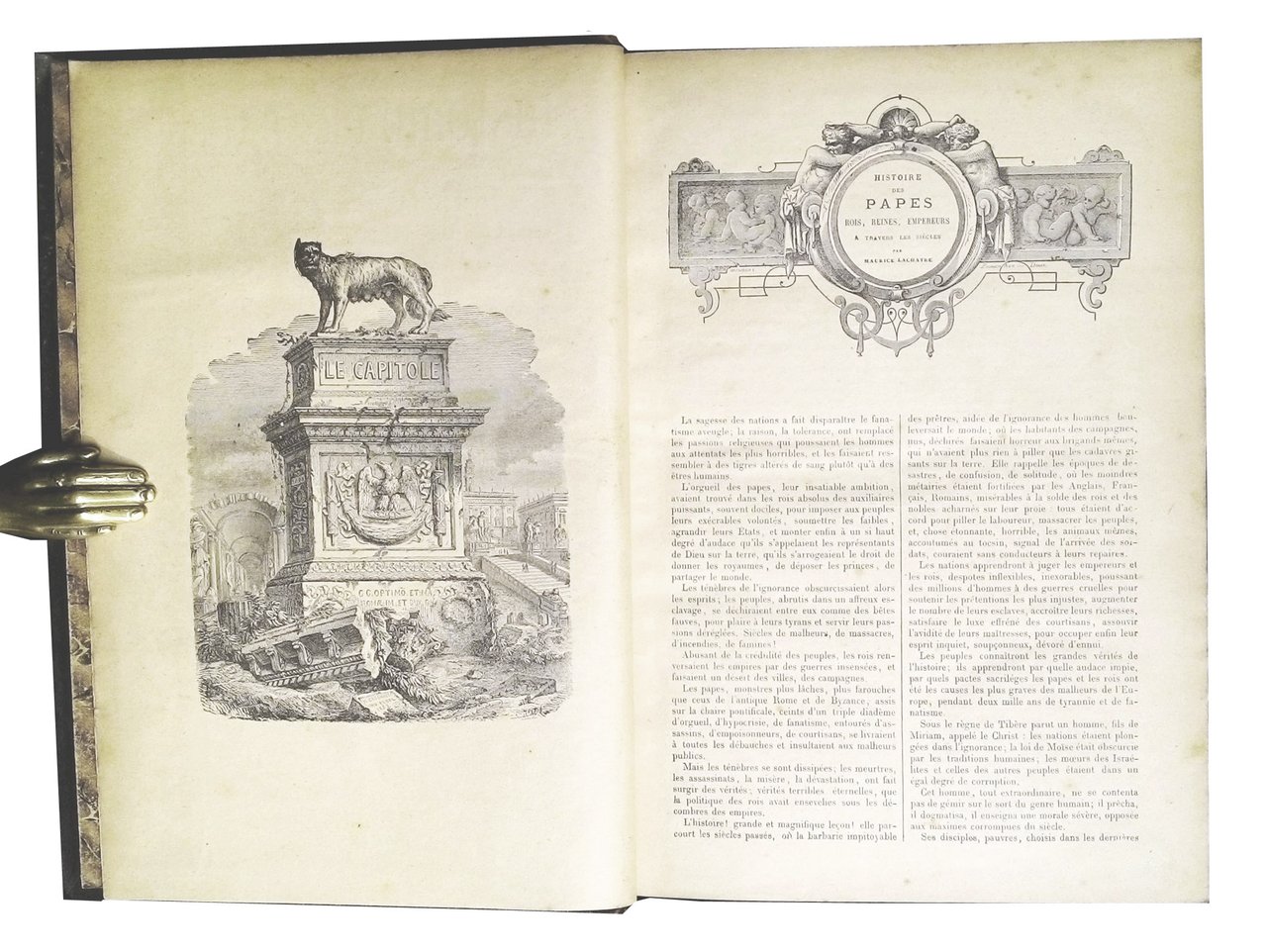 4to (278x190 mm); leg. in pelle (zigrino nero), con dorso a quattro nervi, incisioni a freddo ai piatti, titolo e fregi in oro al dorso, guardie in carta marmorizzata (segni d'uso alle legature e spaccature sui dorsi del I e III vol. nella parte alta delle cerniere anteriori); 3 vol.; vol. 1: pp. 704; vol. 2: pp. 720; vol. 3: pp. 416, 120 (Histoire du Consulat et de l'Empire), 152 (Histoire de la Restauration), 62 (La Monarchie Constitutionnelle, Le second Empire, Tables chronologiques, ecc.), (2); num. ill. in b.n. nel testo e f.t., al frontespizio ed all'occhietto; testo su due colonne. Rara edizione di questa storia del Papato, riportante misteri, adulteri, turpitudini e crimini commessi dai Pontefici Romani, da San Pietro in poi. L’anno di pubblicazione non è indicato, ma dovrebbe essere il 1896. -- Reliure d'edition, 3 volumes. Dos à nerfs, ornés du titre, de la tomaison et de fleurons dorés. Texte sur deux colonnes illustré de nombreuses gravures en noirdans et hors-texte. Contenu Crimes des rois, reines et des empereurs. 3ème volume suivi de l'histoire politique du XIXème siècle comportant l'histoire de l'Empire (120 pages); l'histoire de la Restauration (152 pages), la Monarchie constitutonnelle (13 pages), le Second Empire (62 pages). -- Rif.: IT\ICCU\UBO\3658449 (1 copia). Edizione non censita da OCLC. Cond.: Opera in buone condizioni generali.