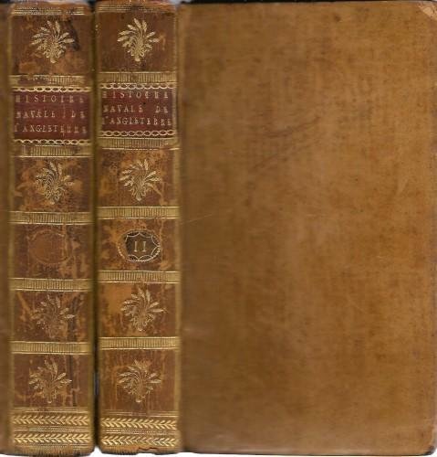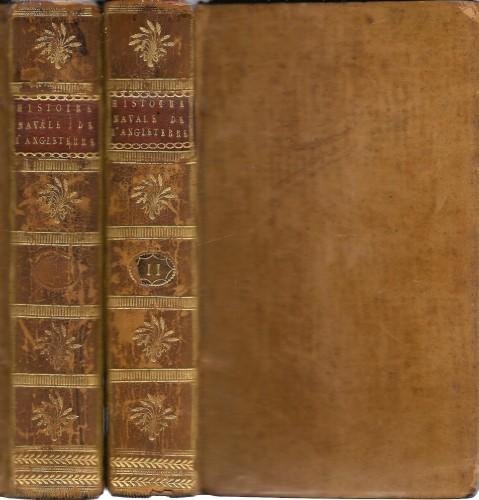 In 12°, pp. 2 b., 4 nn., viij, 491, 2 b. ; 2 b., 4 nn., 492, 2 b.; p/pelle coeva, tit. in oro su tass. al ds. con fregi pure in oro, fregi in oro all'unghia. a storia dettagliata della marina inglese dall'invasione di Giulio Cesare fino alle gesta di Sir Francis Drake contro gli Spagnoli nelle Indie Occidentali e in America meridionale, le lotte con la Francia per il predominio sulla pesca a Terranova e nella Baia di Hudson, la Guerra dei Sette Anni e la conquista del Canada, con le "Observations sur l'Acte de Navigation" e le "Observations sur le Traité de Paix conclu à Paris le 10 janvier 1763; con 1 tav. delle forze navali dell'Inghilterra dal 1688 al 1763, ripiegata alla fine del 2° vol.; ex libris nobiliari alle sguardie. Ottimo esemplare di questa seconda edizione migliore e più corretta della prima. 376/36