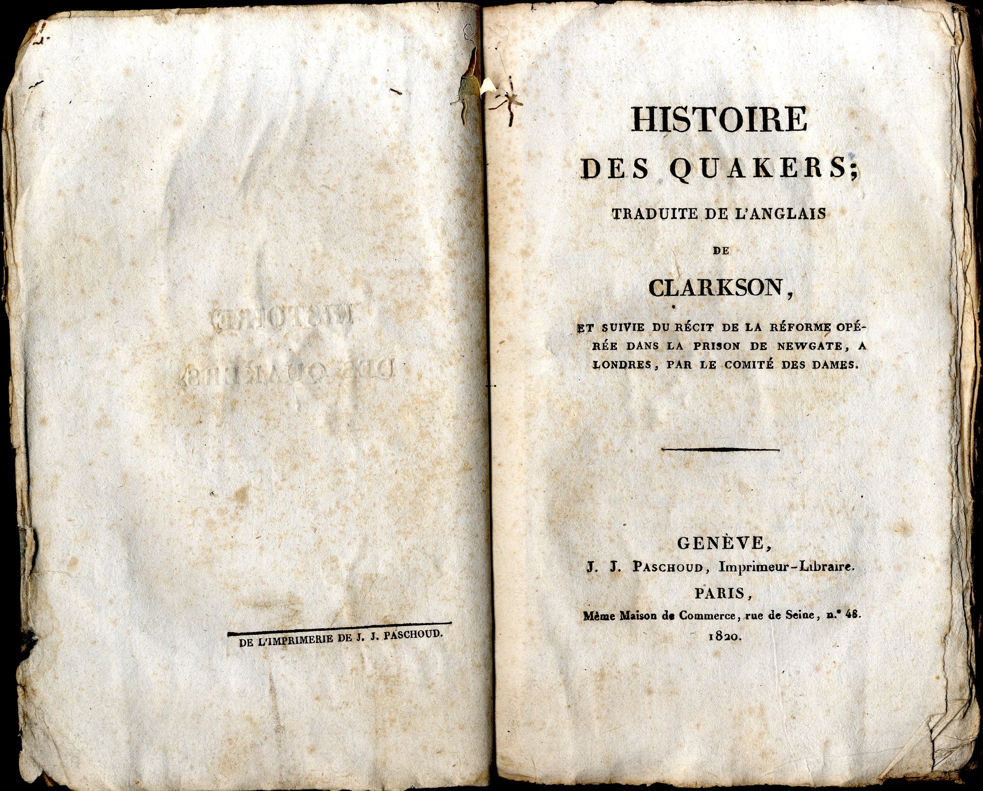 Histoire des Quakers; traduite de l'anglais de Clarkson, et suivie du récit de la réforme operée dans la prison de Newgate, a Londres, par le comité des dames.