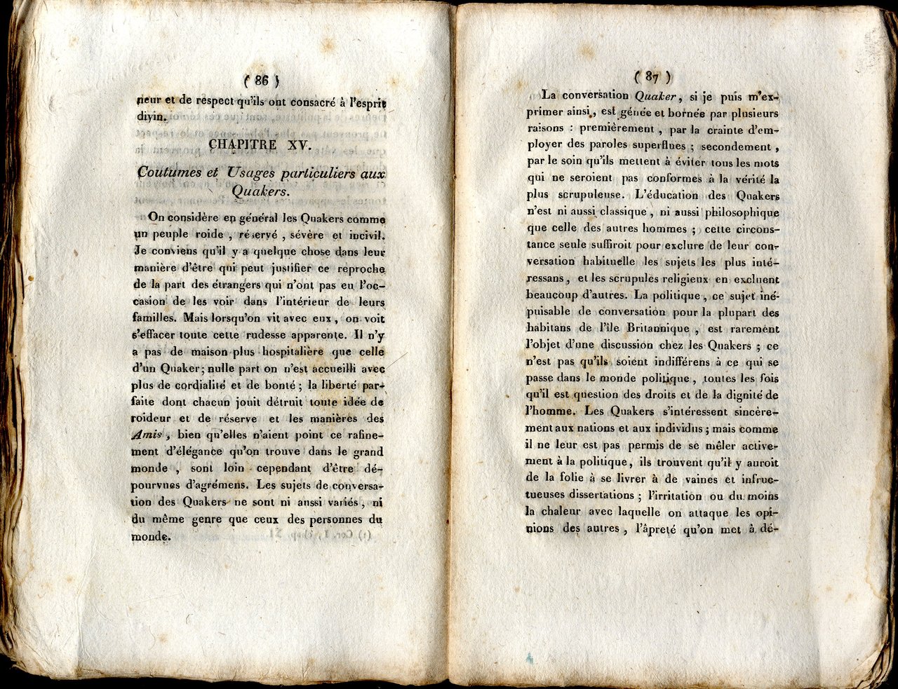 >in-8 (mm 211x133), pp. (4), xvii, (1), 218, (2) di errata, legatura in carta muta coeva. Prima traduzione francese. L'Autore, britannico e pastore anglicano, scrisse e fu attivo politicamente per l'abolizione della schiavitù, concetto a cui fu introdotto dalla lettura di  Anthony Benezet, un Quacchero originario di Philadelphia (Griggs, p 25). Per anni lavorò a stretto contatto con la comunità quacchera al fine di abolire la schiavitù, in America e in Gran Bretagna, pubblicò pamphlet e petizioni al parlamento in questo senso. Il lavoro di Clarkson a stretto contatto con i quaccheri lo portò ad una conversione: nel 1795 rinunciò ai suoi voti religiosi, mentre nel 1806 fu data alle stampe l'opera Portraiture of Quakerism, che ebbe grande fortuna e di cui la presente edizione è la prima traduzione in francese. Il trattato è una scorrevole ma puntuale fotografia della società quacchera americana di fine XVIII° secolo, che ne descrive imperativi morali, usi, costumi, cerimonie, virtù religiose e pratiche comuni. Buon esemplare con qualche fioritura ma nel complesso assai fresco e marginoso.