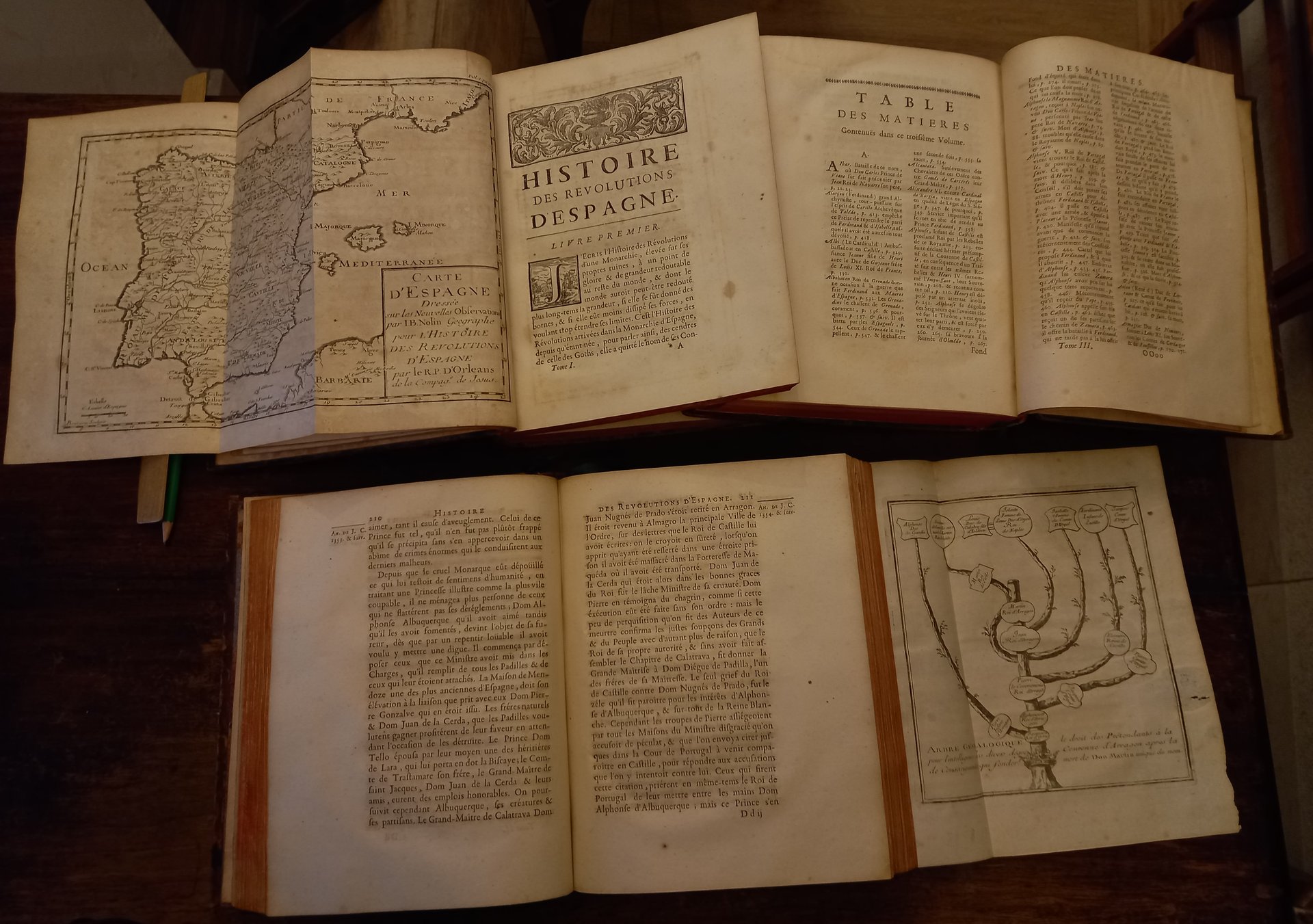 In-4 (25 cm) 3 voll XXVI (1) c. (carta geogr. ripiegata) 579 (37); XIV (2) 644 (28) (1) c. (carta ripiegata); VII (1) 655 (25). Marca xilografica al frontespizio. Testatine e capolettera incisi. Piena pelle, riquadri dorati ai piatti, tassellie e caratteri dorati al dorso. Contropiatti rivestiti di elegante carta decorata. Tagli rossi. d'Orléans Pierre Joseph (1641-1698): (a volte scritto Dorléans), nato il 3 novembre 1641 a Bourges (Francia) e morì il 31 marzo 1698(56 anni) a Parigi, fu sacerdote gesuita francese, predicatore, storico e scrittore spirituale. In quest'opera, si trattano le rivoluzioni di Spagna a partire dalla distruzione dell'impero gotico, all'intera e perfetta riunione dei regni di Castiglia e Aragona in un'unica monarchia. Qualche fioritura, per il resto, ottimo esemplare. In-4 (25 cm) 3 vols XXVI (1) c. (folded map) 579 (37); XIV (2) 644 (28) (1) c. (bound paper); VII (1) 655 (25). Woodcut brand on title page. Engraved headers and drop caps. Full leather, gilt squares on plates, gilt tassels and lettering on spine. Counterplates covered with elegant decorated paper. Red cuts. d'Orléans Pierre Joseph (1641-1698): (sometimes written Dorléans), born November 3, 1641 in Bourges (France) and died March 31, 1698 (aged 56) in Paris, was a French Jesuit priest, preacher, historian and spiritual writer. In this work, the revolutions of Spain are treated starting from the destruction of the Gothic empire, to the entire and perfect union of the kingdoms of Castile and Aragon in a single monarchy. Some foxing. Beautifull copy. French language. Lingua francese.