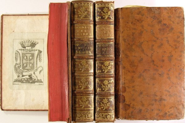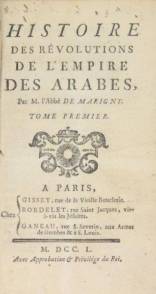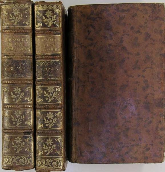 A Paris, Gissey., 1750 à 1752. 4 volumes petit in/8, reliure plein veau moucheté du temps, dos à nerfs à caissons et pièce de titre fauve, tranches rouges, bandeaux, lettrines historiées, tome 1 : lij ff. de page de titre, table et discours préliminaire, 58 p. de table géographique des noms des royaumes, 489 p., 2 ff. de privilèges - tome 2 : page de titre, 1 ff. de table, 519 p. - tome 3 : xiv ff. de discours préliminaire, 540 p., 2 pages dépliantes sur les généalogies de gengiskhaniath et de Tamerlan - tome 4 : 4 ff. de page de titre et préliminaire, 525 p. 3 Coiffes abîmées, quelques mors légèrement ouverts, coins et bords inférieurs usés, tomaisons illisibles, tome 1 : dernier feuillet (p. 489) avec un manque de papier au centre (fin du texte et approbation), tome 2 : erreur de pagination (p.58 au lieu de 85). Rares taches et rousseurs. Contient une généalogie de Mahomet suivie d’une suite chronologique des califes successeurs du prophète et de celle des empereurs de Constantinople. Chadenat 1818, Querard T 5. Brunet Table 1583/84.4 vol. small 8 vo, contemporary full mottled calf, ribbed spine with gilt panels and yellow labels, red edges, headpieces and initial letters, vol 1 : [52], [58], 489 p. [2] - vol 2 : [2], 519 p. - vol 3 : [14], 540 p. - vol 4 : [4], 525 p. Flaws : 3 headspine worn, some joint slightly split, corners & borders rubbed, 2 small wormholes on the binding, lack of paper on the last sheet of the vol. 1 (affecting text and approbation) - error of pagination : 58 instead of 85 of the vol.2 . Occasional foxing and spotting.