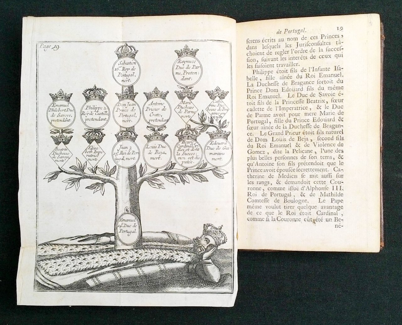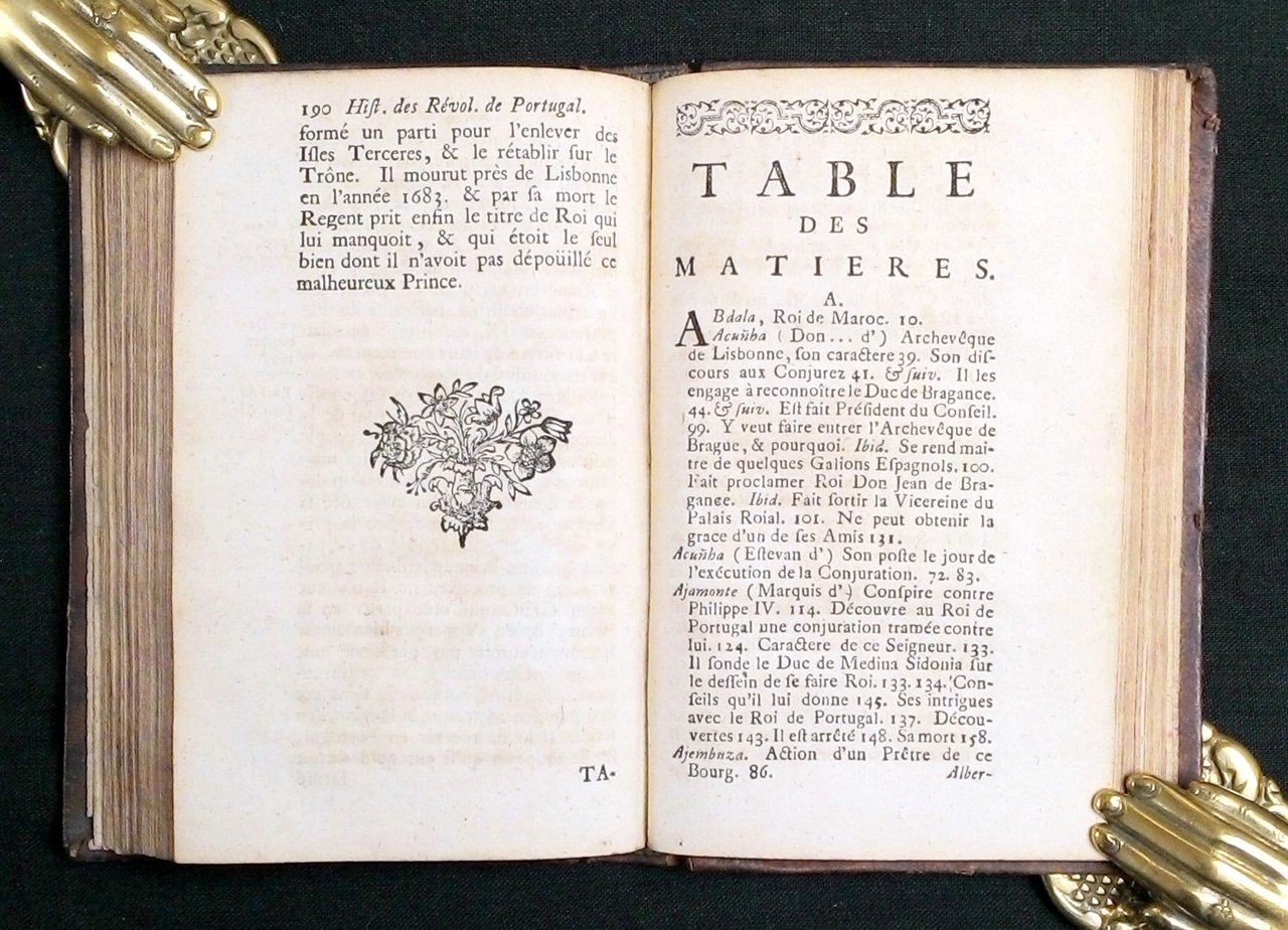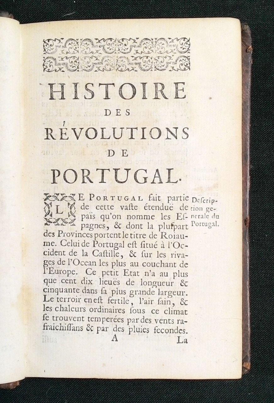 iin-12° (152x92 mm); leg. in pelle bruna, dorso a cinque nervi con compartimenti bordati e con decorazioni floreali dorate, titolo in oro al dorso; pp. (10 c. non num.), 190, (7 c. non num. con la tavola delle materie e 39 con il catalogo dei libri reperibili a l'Aia presso la libreria Scheurleer); bella incisione all'antiporta, frontespizio con caratteri in rosso e nero, testatine e capilettera xil., tavola ripiegata con albero genealogico. Quarta edizione (la prima fu stampata nel 1700 a Londra in inglese, mentre la prima in francese fu stampata a Parigi nel 1711) di questa classica opera sulla storia del Portogallo alla fine del Medio Evo, a cura dell'abate Vertot (1655-1735), storico dell'Ordine di Malta. Rif.: Questa ed. non è censita da ICCU, che invece riporta un'altra edizione stampata a l'Aia nel 1729 (IT\ICCU\NAPE\038217). OCLC, 632827863 e 247983380 (4 copie in Germania), 444933079 (2 copie in Slovenia). Cond.: Piccole tracce di tarlo alle prime tre carte, non interessanti il testo, tracce d'uso; stato di conservazione molto buono. -- Pleine basane brune de l'époque, dos à 5 nerfs orné de caissons dorés, rel. frot.; orné d'une planche dépliante (arbre généalogique) déchirée sans manque [à la fin: catalogue du libraire Henri Scheurlee à La Haye]. L'Abbé de Vertot (1655-1735), fut l'historien de l'Ordre de Malte. Ouvrage classique sur l'histoire du Portugal depuis le Moyen Âge. -- SCARCE 4TH EDITION OF THIS HISTORICAL WORK ON PORTUGAL AT THE END OF THE MEDIUM AGE. Very good conditions.