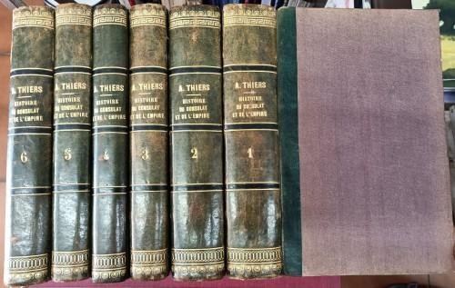 in 8° grande (cm 27x18), vol. 1° pp. 4, 822, 2; vol. 2° pp. 4, 828, 4; vol. 3° pp. 4, 572, 8; vol. 4° pp. 4, 548; vol. 5° pp. 4, 600; vol. 6°, pp. 4, 693, 3; leg. coeva m/pelle verde con tit. e fregi in oro ai ds., piatti telati, vignette ai front., testo su 2 colonne. L'A. fu storico e uomo di stato sotto vari governi, molto competente in politica internazionale, acuto critico e oppositore della politica imperiale di Napoleone III, avversò la costituzione dell'unità italiana e germanica, perché nella prima vedeva la continuatrice della vecchia politica sabauda e, nel grande impero tedesco che stava formandosi, vedeva risorgere il vecchio impero di Carlo V, pronto ad appoggiarsi sull'Italia invece che sulla Spagna e formare contro la Francia un blocco imponente di forze. Più fedele alla patria che ai regimi e ai partiti, più ricco di buon senso che di visioni larghe e profonde il Thiers ebbe grandi qualità politiche che usò per impedire la rovina della Francia. Opera ill. da 82 tavv. f.t. e mm. ill. n.t. come grandi testatine, finalini e capilettera. Esenplare fresco e in ottimo stato, solo qc. trascurabile abrasione ai ds. 262/36COLF