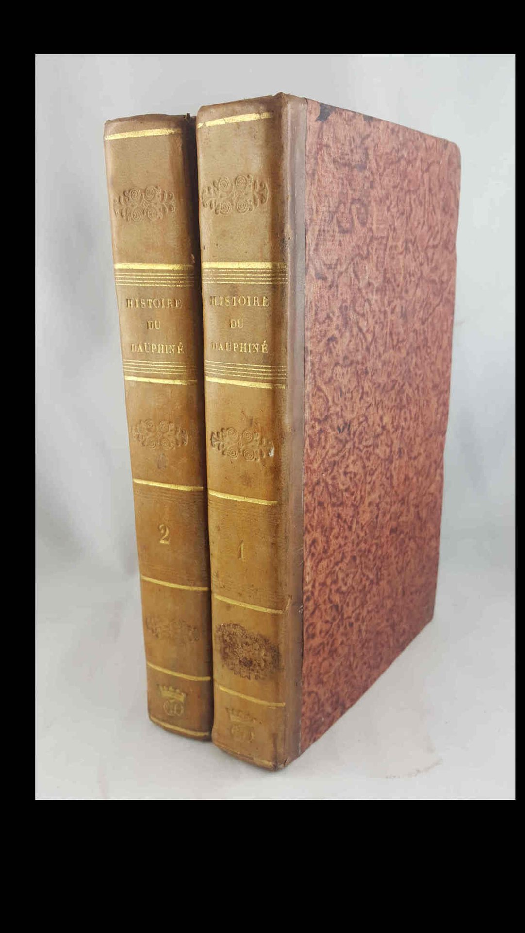 >2 vol. in-8, pp. (4), XVI, 478; (4), 508; legatura del tempo mezza pelle, dorsi con monogramma e corona in oro, titolo e filetti oro, fregi a secco, tagli marmorizzati. Prima edizione di quest'opera sulla storia del Delfinato dalle origini a Luigi XVIII, assai rara. Bell'esemplare. Non in Perret.