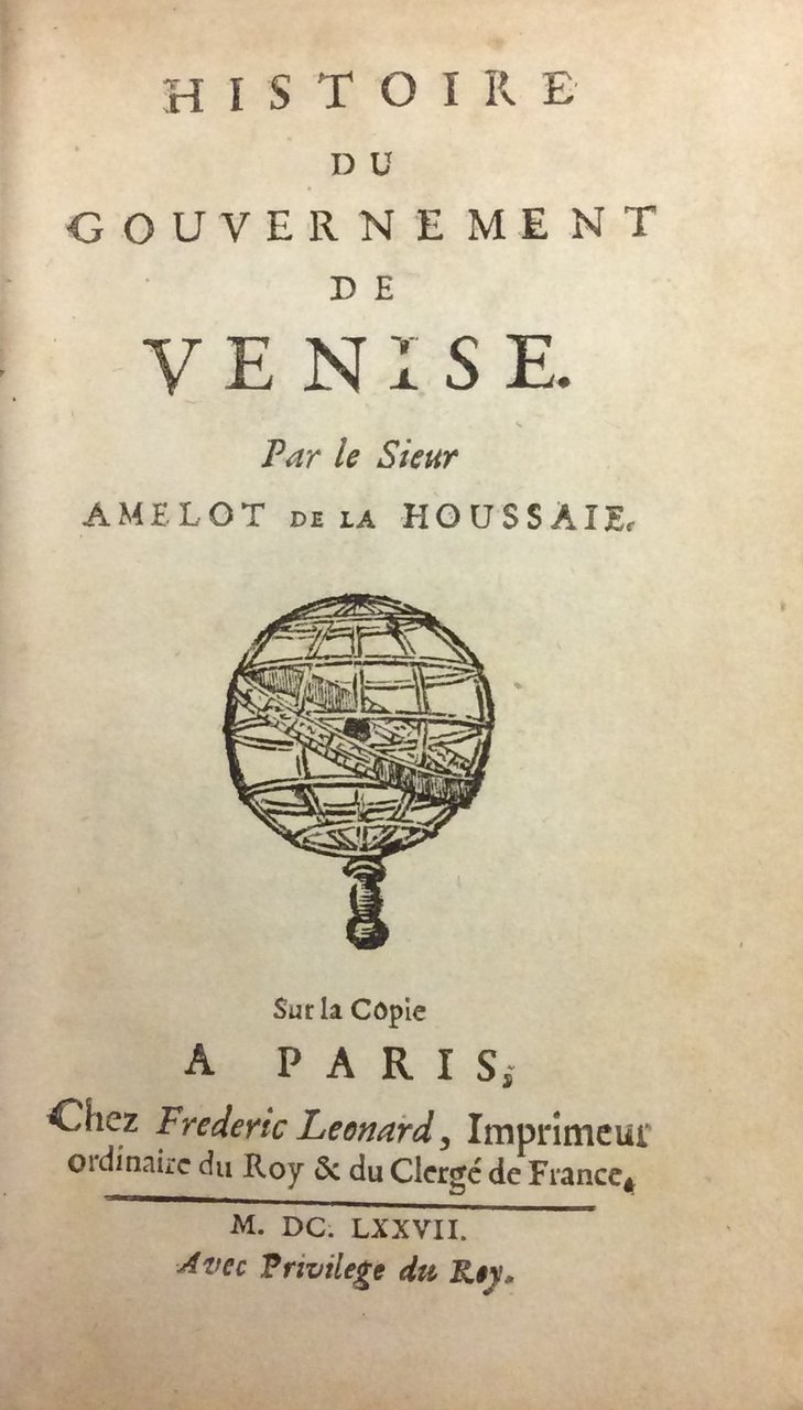 In-24, 3 parti in 2 volumi, p. pergamena coeva (antiche scritte a penna ai risg.), ogni parte con proprio frontespizio con xilografata una sfera + un frontespizio generale con titolo completo. L'opera è così composta:- Ia Parte (mm. 130x75), p. pergam. con unghie, bella antiporta figurata che rappresenta anche la piazza San Marco, di pp. (24, inclusi i due frontesp.),550,(36, inclusi l'Indice dei capitoli e delle materie).- IIa e IIIa Parte (mm. 125x70), p. pergam., contenente il "Supplément", di pp. 237,(3) e l' Examen de la liberté originaire de Venise traduit de l'Italien. Avec une Harangue de Louis Hélian, Ambassadeur de France contre les Vénitiens, traduite du Latin, Ratisbonne, chez Jean Aubri, 1677, di pp. 211,(3). "Mancano frontespizio e prime 6 cc.nn. (dedica e prefazione)" della terza parte, qui in fotocopia.Più che una storia di Venezia, questo resoconto contiene importanti rivelazioni sulla politica del governo veneziano ed è uno studio critico delle sue istituzioni e delle sue leggi. L'opera provocò indignate proteste da parte dell'ambasciatore veneziano Giustiniani e l'autore, che era stato segretario dell'ambasciata francese a Venezia, fu rinchiuso nella Bastiglia, per cercare di soddisfare la Serenissima. Il Supplemento studia e racconta le controversie che la Repubblica ebbe con Papa Paolo V. La terza parte, con remarques historiques sur le traité de la liberté de Venise, contiene anche l'arringa di Louis Hélian, pronunciata nel 1510 davanti all'imperatore Massimiliano, che accusa aspramente la Repubblica veneziana di tanti mali. Per aver svelato i misteri del governo della Serenissima e le cause della sua decadenza, l'autore ebbe naturalmente parecchie noie con la censura che non ne ostacolarono però il successo, anche internazionale: l'opera fu infatti tradotta in varie lingue.Rara "seconda edizione", in parte originale, di certo preferibile alla prima del 1676 che contiene solo la prima parte. Alla data del 1677 l'opera fu pubblicata più volte ma solo questa ediz. è completa delle tre parti.Cfr. Cicogna, nn. 1092 - 1093 per la ns. ediz., le ristampe e la traduz. in italiano in cui precisa: Non era mancato ingegno al sig. d'Amelot (dice Foscarini) per guidare ad ottimo segno il suo Trattato sulla Repubblica di Venezia: ma due cose lo guastarono, l'animo avverso alla città ns., e il soverchio raffinamento dell'autore. Il Langlet dice che l'opera dell'Amelot è un poco troppo satirica e che l'Amelot era in collera co' i Veneziani quando l'ha scritta - Lozzi,II, n. 5865 per le varie ediz., a partire dal 1676. Amelot de la Houssaye, famoso pubblicista francese, nato a Orléans nel febbraio 1634, morto a Parigi l'8 dicembre 1706, fu prima segretario dell'ambasciata a Venezia, e poi si dedicò allo studio della storia, della morale e della filosofia.Pagine lievem. ingiallite per la qualità della carta; solo secondo vol. con aloni intercalati nel testo ma complessivam. buon esemplare.