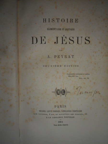 par A. Peyrat. Paris, Michel Levy Frères, 1864. Histoire elementaire et critique. In-8°, m.tela con angoli, titolo in oro entro tassello al dorso. xiv, 351 pp. Esemplare in legatura nuova con lievi arrossature sparse. Neg. mens. bianca cassa