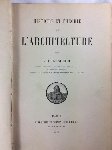 In-8 gr. (mm. 265x178), mz. pelle coeva, dorso a cordoni con fregi e titolo oro, pp. (4),527, con oltre 124 figg. nel testo e 2 tavole a doppia pag. fuori testo relative alla cupola di S. Pietro. Storia e teoria dell'arte dalle origini ai tempi moderni, così suddivisa: architettura egiziana (da Phtha, primo re d'Egitto, fino alla dominazione romana) - Etruria (ordine toscano) - architettura greca - architettura romana (ordine dorico, ionico, corinzio) - da Vitruvio a Bramante. Molto ben conservato.
