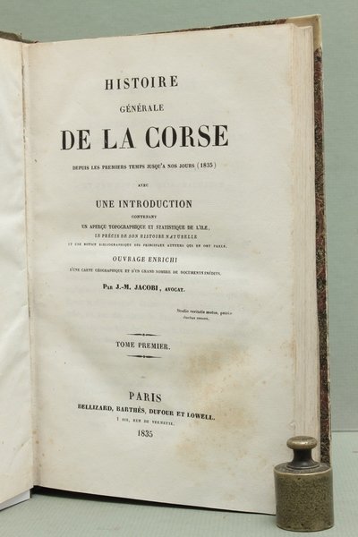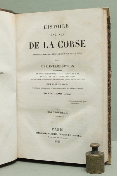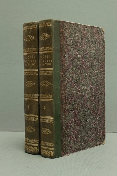 Edizione originale. Opera esaustiva, che si occupa della storia dell'isola dalle origini fino alla contemporaneità dell'autore. Da notare la grande tavola ripiegata, che rappresenta i diversi arrondissement: d'Ajaccio, di Bastia, di Calvi, di Corte, di Sartene. Un terzo volume, originariamente previsto, non fu mai pubblicato.
