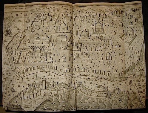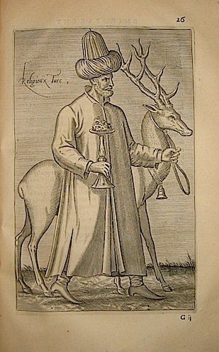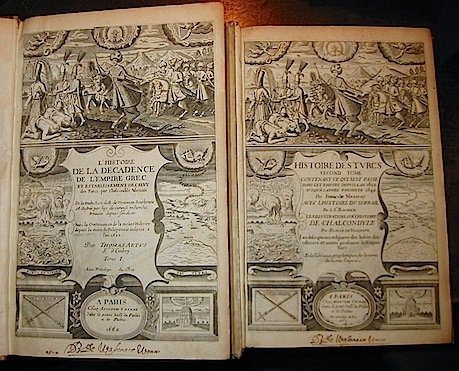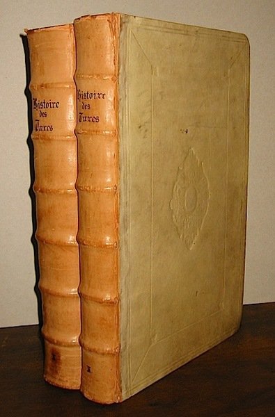 Folio (cm. 37,5), 2 Voll., 12 cc.nn. (compreso primo frontis. figurato ‘L’Histoire de la decadence de l’Empire Grec et establissement de celuy de Turcs.’), 907(1) pp., 14 cc.nn.; 6 cc.nn. (compreso primo frontis. figurato ‘Histoire des Turcs second tome.’), 204 pp., 8 cc.nn., 89(1) pp., 1 c.nn., 85(1) pp., 5 cc.nn., 64 cc., 1 c.nn., da p. 67 a p. 116, 2 c.nn., 273 colonne, 3 pp.nn. Con complessive 106 grandi incisioni su rame n.t. e 2 tavv. rip. f.t. (’La ville de Constantinople’ e ‘Portraict de l’armée de l’empereur Turc.’). Frontis. in caratteri rossi e neri. Ottime legature in mz. pelle color nocciola con nervi. Titolo e numerazione dei voll. ms. al ds. Piatti, con decoro impresso a secco, in pergamena antica bianca. Carte di guardia rinnovate. Alcune pagine leggermente ingiallite altrimenti esemplare in eccellente stato di conservazione. Edizione originale (Il privilegio reale per la pubblicazione dell’opera fu concesso a tre stampatori parigini: Cramoisy, Courbé e Bechet) della raccolta di alcune opere dall’importante apparato iconografico riguardanti la storia ed il costume dell’Impero Ottomano.