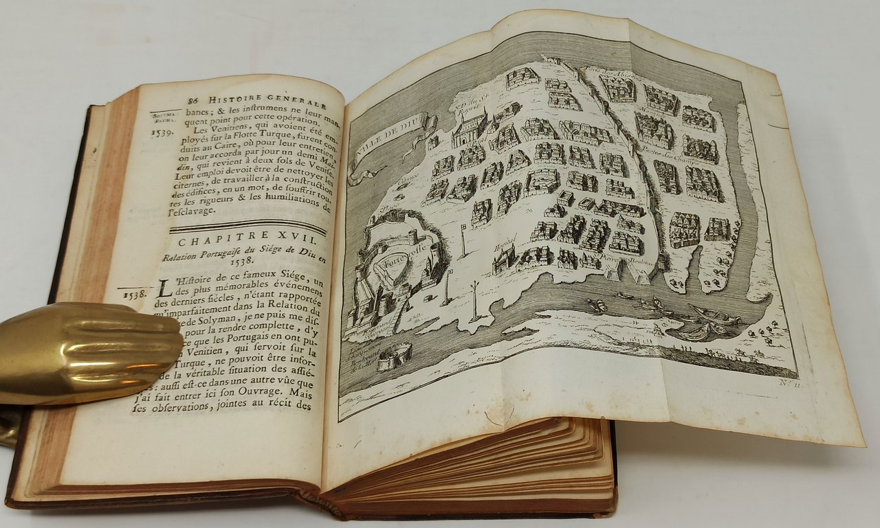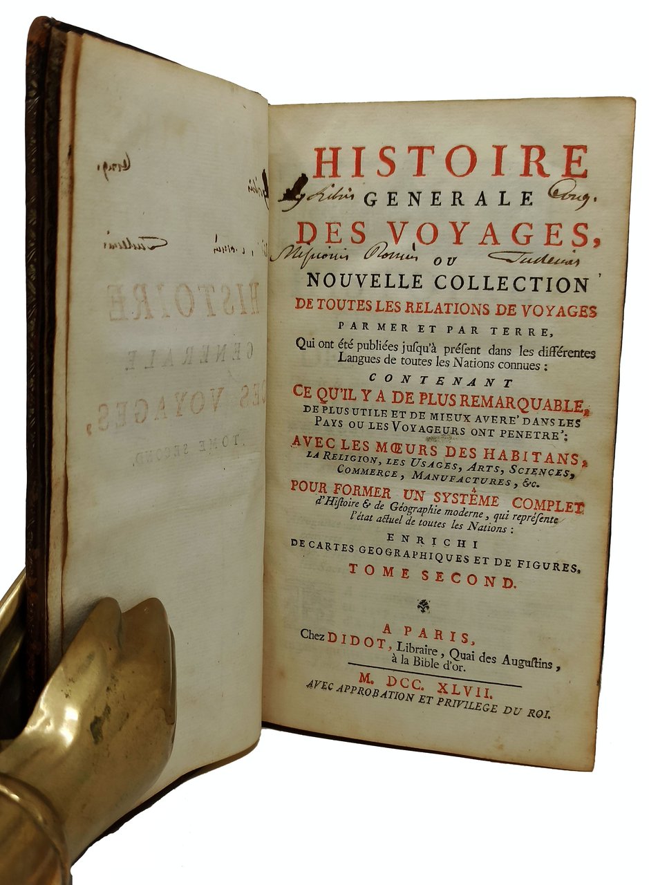 'HISTOIRE GENERALE DES VOYAGES ou nouvelle collection de toutes les relations de voyages par mer et par terre, qui ont été publiées jusqu'à present dans les différentes Langues de toutes les Nations connues: contenant ce qu'il y a de plus remarquable, de plus utile et de mieux avere' dans les Pays ou les Voyageurs ont penetre': Avec les moeurs des habitans, la Religion, les Usages, Arts, Sciences, Commerce, Manufactures, ec. Pour former un systeme complet d'Histoire e de Géographie moderne, qui représente l'etat actuel de toutes les Nations / TOME SECOND (Voyages au sud-est et aux Indes Orientales / Premiers voyages des anglois en Guinée & aux Indes Orientales)'. Anno: M. DCC. XLVII. [1747]. Dimensioni: in-12° (10 x 17 cm circa). 450 pagine. Prima edizione in piccolo formato, della prestigiosa opera di Prevost. con una pianta geografica della 'Ville de Diu' (più volte ripiegata su se stessa) e due tavole incise in rame fuori testo. Stato di conservazione: Un alone (presumibilmente causato da una pregressa umidità) sul margine verticale bianco (bordo) delle pagine interne (su molte appena visibile, su altre leggermente più marcato); un timbro riportante il nome di un antico proprietario sulla prima pagina bianca ed una firma d'appartenenza a penna sul frontespizio; un forellino di tarlo sul bordo bianco inferiore della pianta geografica fuori testo; un minuscolo foro sul foglio che contiene la pagina 269-270, uno strappo (senza mancanza) sul bordo bianco verticale del foglio che contiene le pagine 399-400,qualche leggero segno d'usura sulla coperta e sul dorso ma, nel complesso, un esemplare abbastanza ben conservato. la presente inserzione fa riferimento esclusivamente al tomo secondo di quest'opera. In questo volume sono presenti: - 'Voyages au Sud-Est et aux Indes Orientales', - 'Premiers voyages des anglois en Guinée & aux Indes Orientales'. Rilegatura coeva in pelle con titoli e decorazioni in oro sul dorso a cinque nervi. Tagli rossi, sguardie in carta marmorizzata.