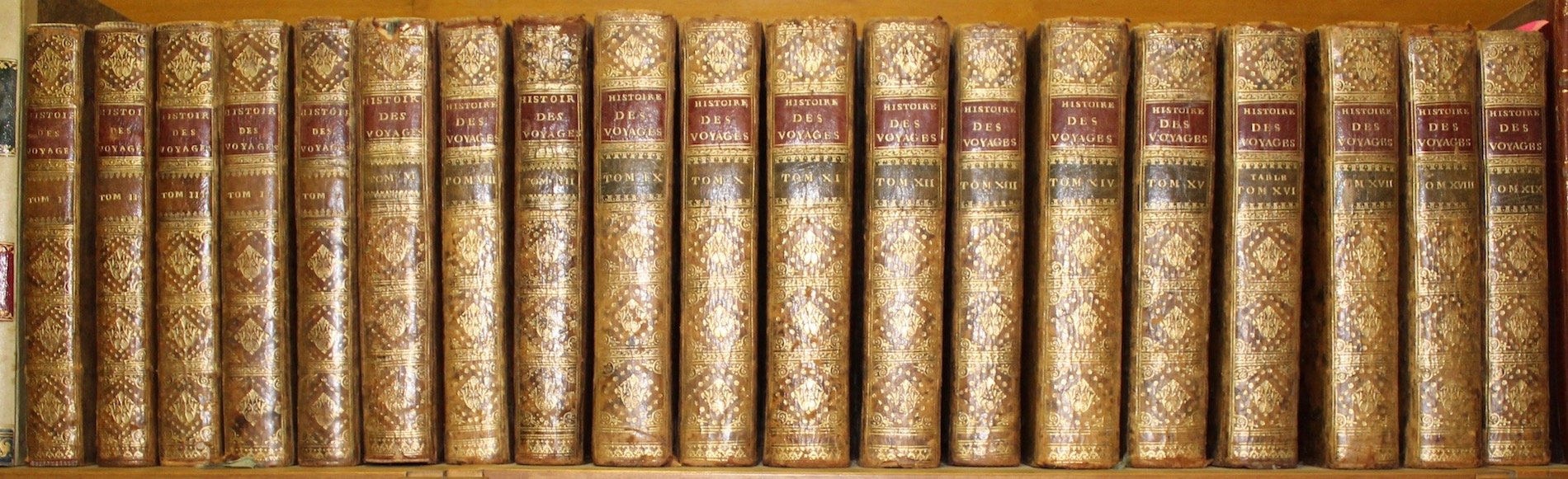 Vol. 19, In 4° (265x 200), frontespizio in rosso e nero, grande ritratto dell'autore in antiporta al primo volume, raffinate testatine di carattere antropologico che accompagnano tutti i volumi, il tutto inciso finemente in rame da J.V. Schley, finalini silografici. L'opera è accompagnata da un ricco apparato iconografico di 515 tavv. così suddiviso:155 carte geografiche colorate a mano d'epoca ai confini, f.t. ripiegate più volte; 360 tavole incise in rame, sempre f.t., molte ripiegate, raffiguranti vedute di città, piante topografiche, usi e costumi religiosi e sociali dei vari popoli del mondo. Elegante legatura coeva in piena pelle di vitello marmorizzata con dorso a riquadri e tasselli in oro, doppio filetto a secco ai piatti, tagli rossi, dentelle con fregi in oro. Una fra le migliori edizioni della monumentale raccolta di viaggi di Prevost (1697-1763), quasi sempre pubblicata in Ottavo con le tavole di formato ridotto e ripiegate. L'opera è suddivisa nel seguente modo: i primi quattro volumi comprendono viaggi inglesi e portoghesi in Africa e nelle Indie Orientali; i voll.V-VII, descrivono Cina, Corea, Tartaria e Tibet; i voll. VIII-IX comprendono i viaggi olandesi e francesi alle Indie Orientali; i voll. X-XI riguardano India, Filippine e Antartico; i voll. XII-XV trattano le Americhe; il vol. XVI è di indice generale; il vol. XVII è un supplemento ai voll. VIII, IX, X e XI. Il vol. XVIII tratta dei viaggi nelle terre artiche, Islanda, Jan Mayen, Siberia, Russia; il vol. XIX tratta Groenlandia e Kamchatka.Ottimo esempl. completo di tutte le tavole, genuino, marginoso; ottimo lo stato di conserv. int. tranne piccoli tarli saltuari a due tomi ed uno doppio al marg. int. del vol.XVI per alcune pagg., che non lede il testo; alcuni dorsi e cerniere con lievi mende, piccole mancanze agli angoli dei piatti di alcuni tomi.