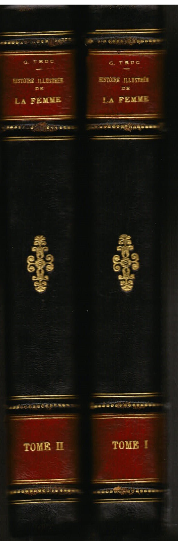 2 volumi in-8°, pp. 219, (3); 205, (3); legatura m. pelle e angoli con fregi in oro e titolo in oro su doppio tassello in pelle rossa su dorso a nervetti. Piatti marmorizzati. Brossure figurate conservate. Centinaia di illustrazioni in b.n. a p. pag. 10 tavv. a colori f.t. Perfetto stato. Edizione originale. Storia delle donne dall'antichità mesopotamica al XX secolo.
