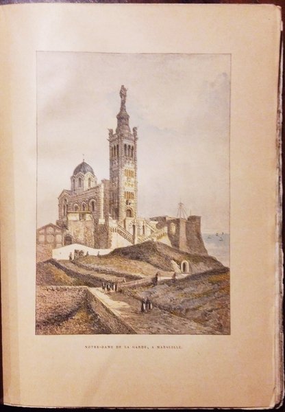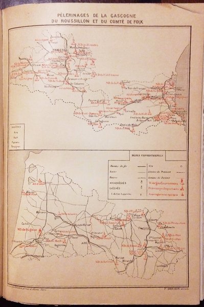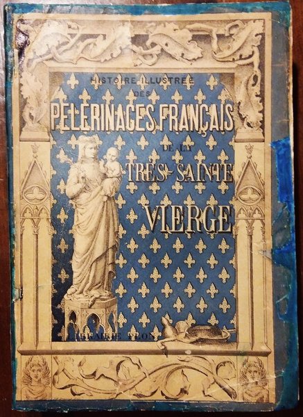 450 incisioni indite in b / n e a colori di M. Hubert - Clerget e 20 carte geografiche f.t. dei percorsi di pellegrinaggio alla Beata Vergine in Francia. Ed. Librairie Plon & Nourrit et Cie - Paris, 1890. Brossura editoriale con dorso non originale e restauri ai margini esterni delle copertine. Piccola dedica del tempo all'occhietto. Interno freschissimo e intonso. 20,5x29; pp.1272. Opera Rara e splendida. Intonso, Buonissimo stato. ,